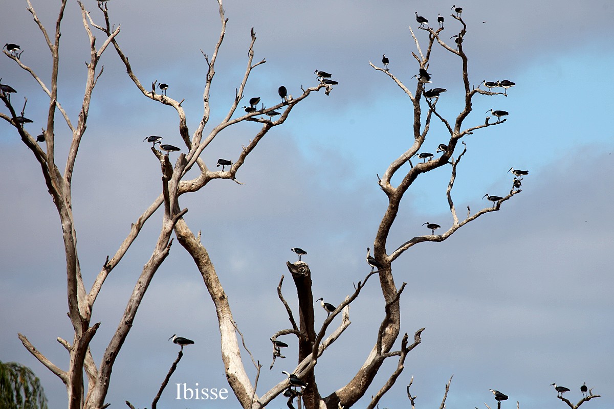 Kurz vor 9.00 h kamen wir etwas ernüchtert wieder auf dem Highway an. Diese Rundfahrt hatte sich wirklich nicht gelohnt. Wir fuhren weiter Richtung Northcliff, meistens durch dichte Wälder. Kurz vor Northcliff gegen 9.30 h sahen wir erst einen Elegant Parrot hoch auf einem Baum sitzen, dann gleich neben der Straße einen Splendid Fairy-wren, der noch ein leuchtend blaues Prachtkleid trug. Für ein gutes Foto reichte es leider nicht. Ein weiteres Vögelchen auf einem Zaun sitzend haben wir erst später identifizieren können, es war ein Rufous Songlark. Hinter Northcliff, einem kleinen sauberen Örtchen, sahen wir einen großen Schwarm Ibisse auf einem Baum sitzen, zahlreiche weitere kreisten in der Luft, insgesamt sicher um die 100 Vögel. |