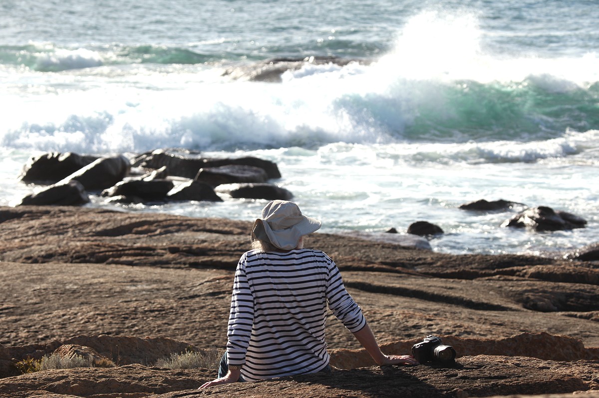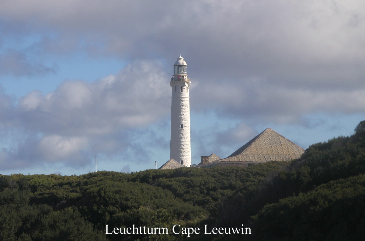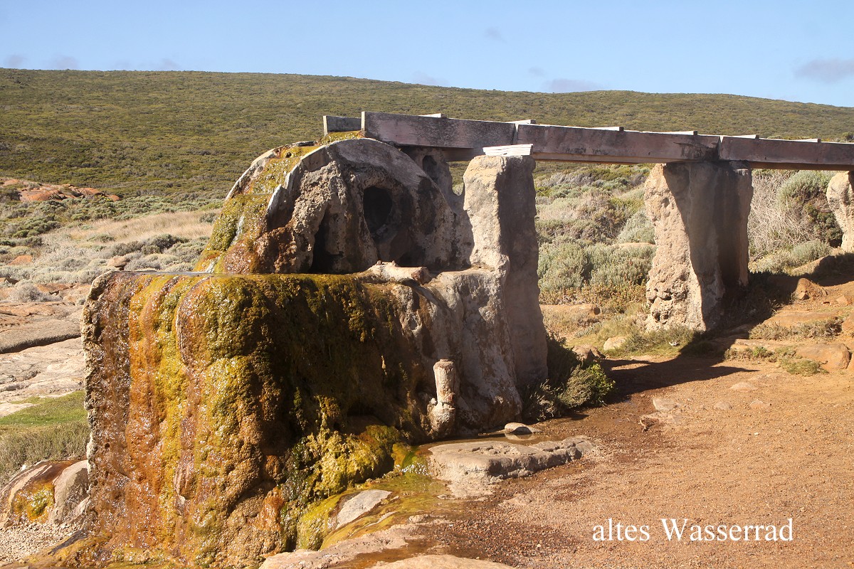 So gestärkt machten wir uns auf die letzten km nach Augusta, das wir um 13.15 h erreichten. Augusta liegt an der äußersten Südwestspitze Australiens, dort wo Indischer Ozean und Southern Ocean zusammentreffen. Das Örtchen ist wesentlich kleiner, als wir es uns vorgestellt hatten. Es gab aber einen IGA-Supermarkt, wo Tomoko zunächst wieder Lebensmittel einkaufte. Anschließend fuhren wir 4 km weiter zum Flinders Bay Caravan-Park, der ziemlich bevölkert war. Wir konnten uns unter den verbleibenden 4 oder 5 Plätzen einen aussuchen. Die Nr. 30 gefiel uns am besten und so belegten wir diesen. Der Preis für eine Nacht war mit 38,- $ nicht gerade billig. Wir installierten erst mal alles. Gleich kamen wieder einige Splendid Fairy-wrens zu uns, das Männchen allerdings nicht mehr so farbenfroh. Tomoko packte alle schmutzige Wäsche zusammen und ging damit in die Laundry. Ein Waschgang kostete zwar 4,- $, aber die Maschine wusch mit warmem Wasser. Ich fing derweil schon mal an Tagebuch zu schreiben. Um 16.00 h brachen wir auf zum 5 km entfernten Cape Leeuwin, der äußersten Landspitze Südwest-Australiens, auf der weithin sichtbar ein Leuchtturm steht, der auch heute noch eine wichtige Funktion hat. Hier in der Nähe soll auch der seltene Rock Parrot vorkommen, eine Papageienart, die hier in den Felsen brütet. Wir gingen zunächst an eine Stelle direkt am Meer, wo ein altes Wasserrad zu sehen ist. Dieses ist nicht mehr in Betrieb. Es diente früher dazu, eine Pumpe anzutreiben, die den Leuchtturmwächter mit frischem Wasser versorgte. Heute fließt das Wasser aus einer nahen Quelle über das weitgehend versteinerte Mühlrad ins Meer. Die Rock Parrots sollen diese Stelle zum Trinken benutzen. |