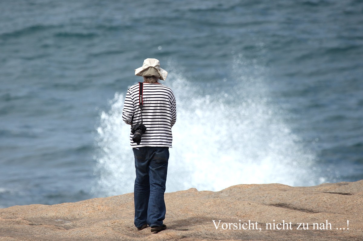 Ich nutzte noch die Gelegenheit ausgiebig zu duschen. Anschließend packten wir alles ein und waren um 9.40 h startbereit. Zunächst fuhren wir noch mal zum Leuchtturm. Der Eintritt kostete 5,- $ pro Person, gilt aber nur für das Betreten des Geländes, nicht für das Besteigen des Leuchtturms. Gleich hinter dem Eingang begrüßte uns ein Warnschild "Achtung Schlangen". Ich wanderte bis zur äußersten Spitze des Kaps, dort wo Indian Ocean und Southern Ocean zusammentreffen. Eine gewaltige Brandung toste gegen die mächtigen Felsen. |