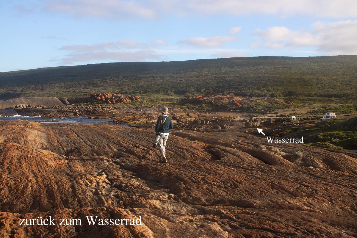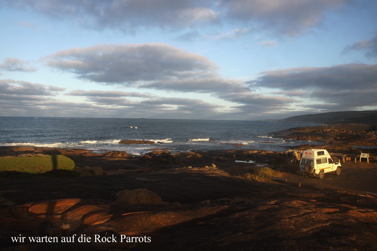Wie gewöhnlich wachten wir beim ersten Tageslicht auf. Ich war schon gegen 5.00 h wach, Tomoko erst eine halbe Stunde später. Da wir sehr früh wieder zum Cape Leeuwin wegen der Rock Parrots fahren wollten, standen wir schnell auf, zogen uns an, schlossen die Türen sehr leise, um die Nachbarn nicht zu stören und fuhren um 5.45 h los. Kurz nach 6.00 h kamen wir am alten Mühlrad an. Wir stiegen zunächst nicht aus, sondern beobachteten das Wasserloch davor aus dem Auto. Nach kurzer Zeit tauchte ein Rock Parrot am Boden auf, war aber im noch nicht sehr hellen Morgenlicht schlecht zu erkennen und flog auch bald weg. Ich stieg aus und setzte mich etwas abseits auf einen Felsen. |