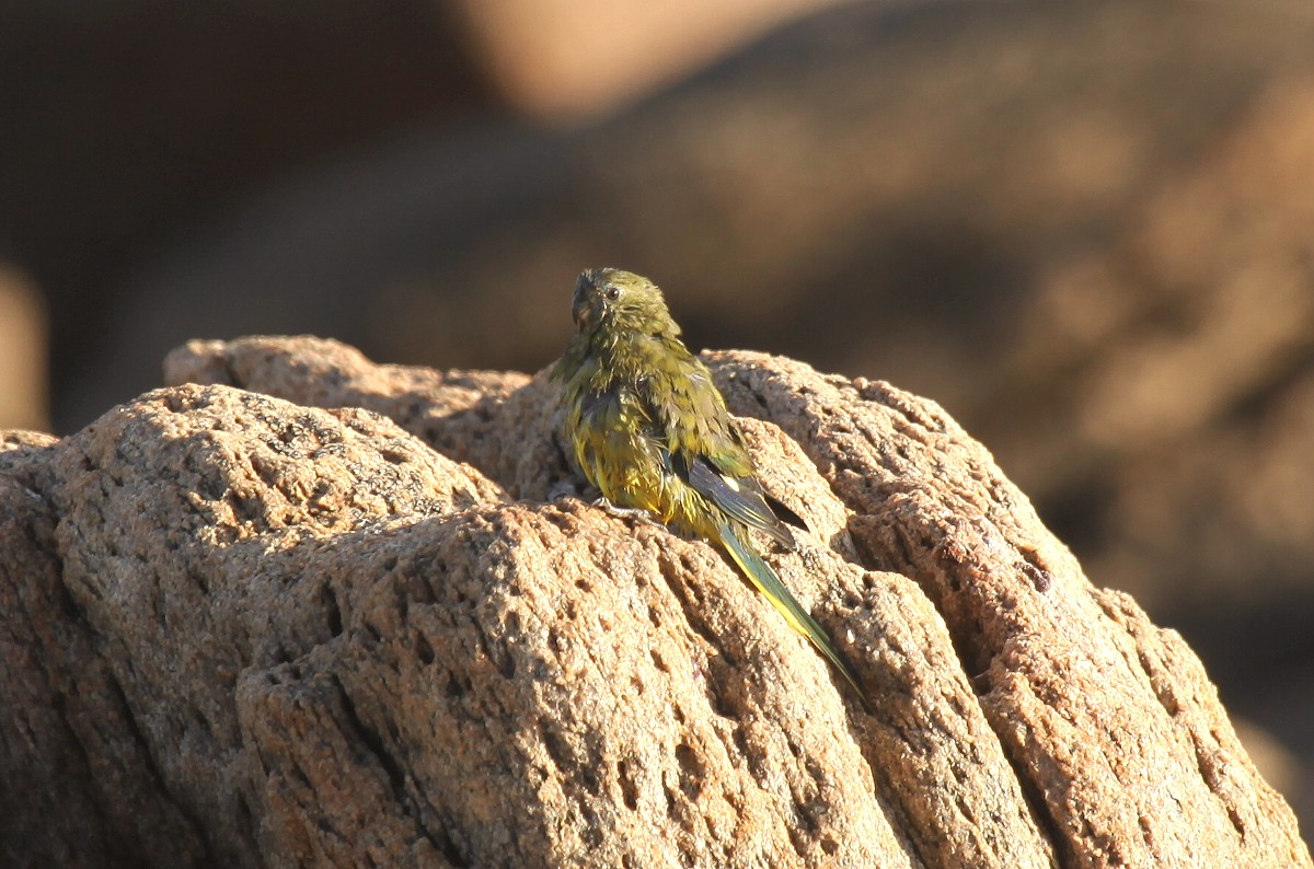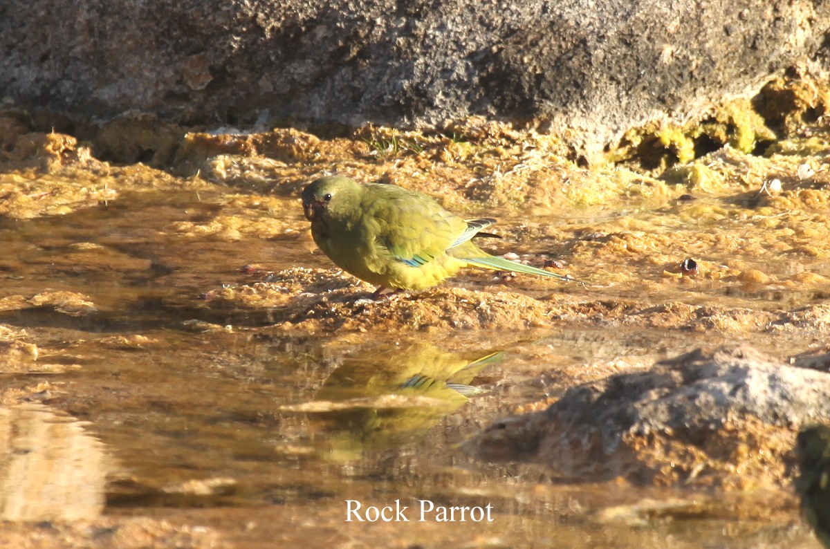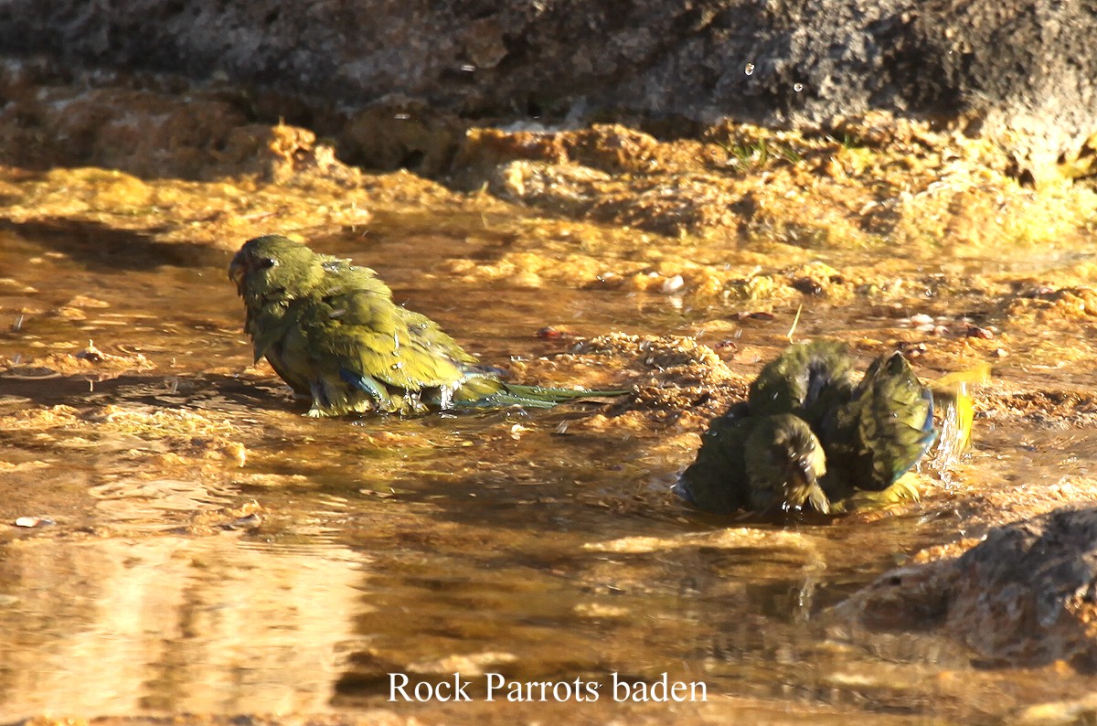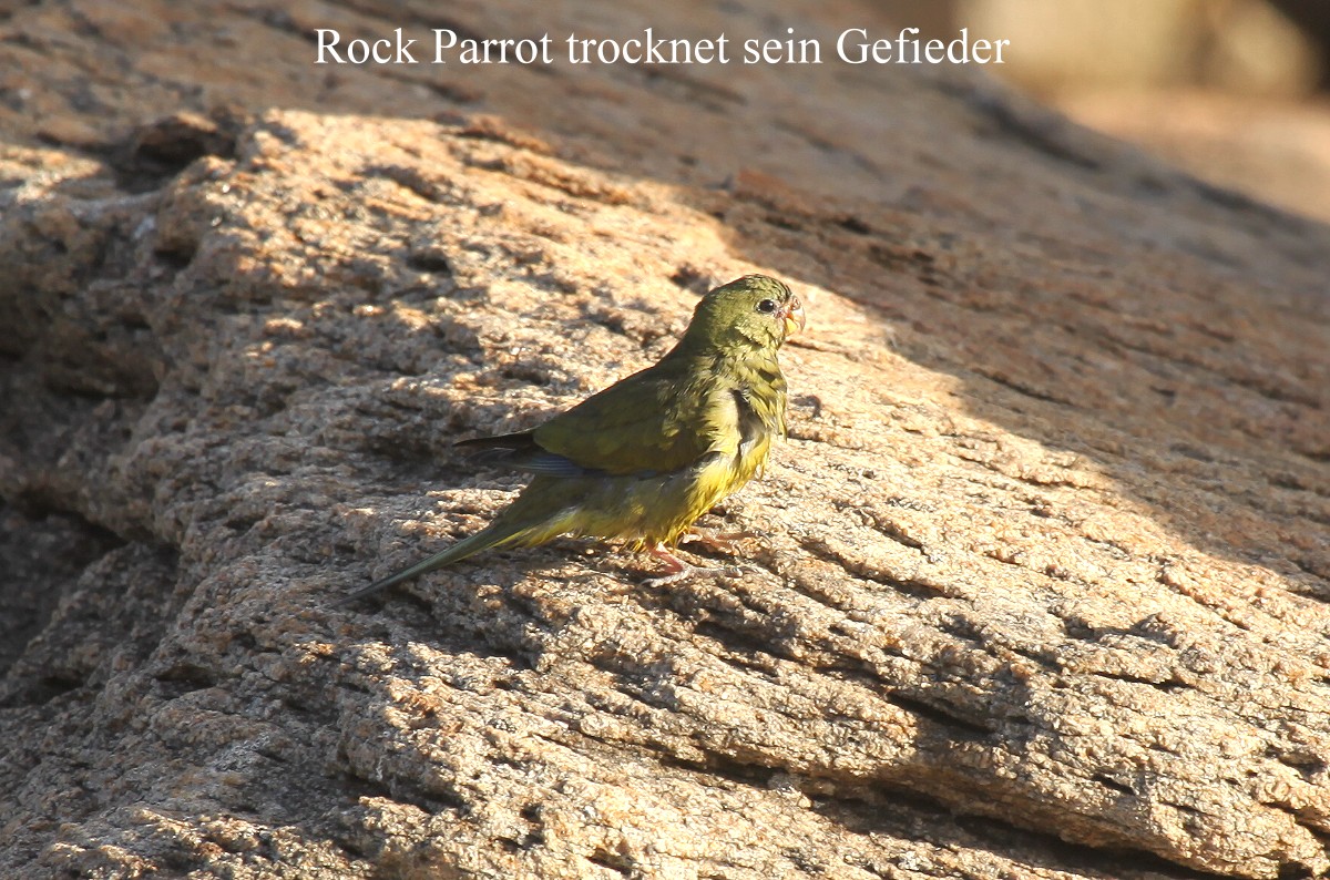 Erst als wir unsere Runde fast beendet hatten tauchten plötzlich in schnellem Flug 5 Rock Parrots auf, die sich direkt am Wasserloch niederließen und badeten. Die Fotos, die Tomoko machte, zeigten fast nur patschnasse Vögel, deren Gefieder im Licht der aufgehenden Sonne leuchteten. |