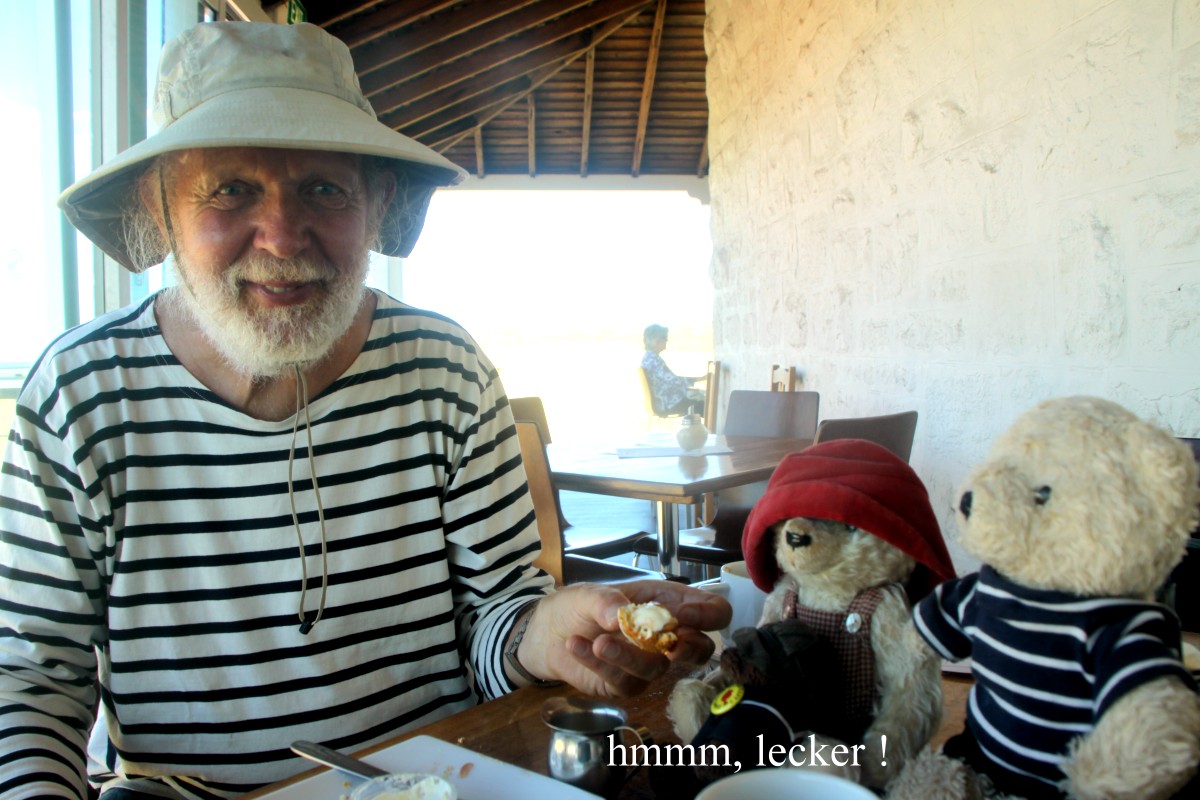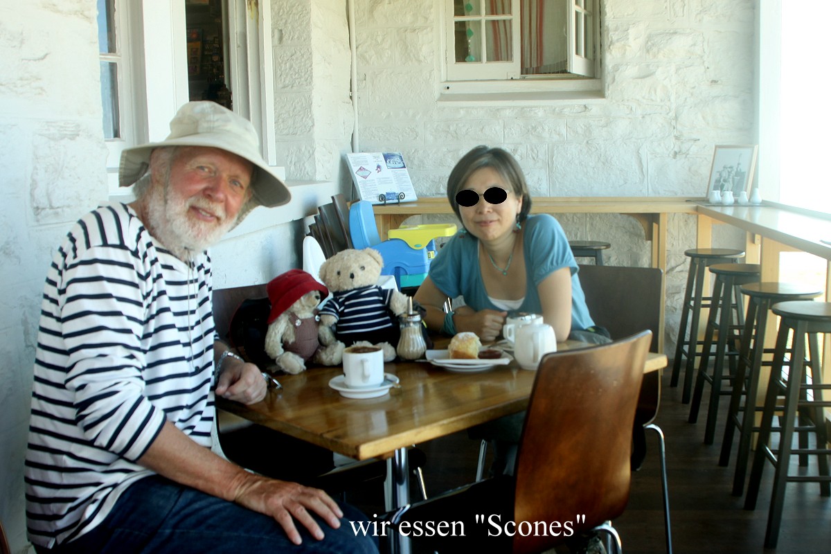 Zahlreiche kleine Inseln und Felsriffe breiten sich aus. Hier hat schon manches Schiff in der Vergangenheit Schiffbruch erlitten. Einer Hinweistafel entnahmen wir, dass bevor der Leuchtturm 1895 in Betrieb genommen wurde, 27 Schiffe an den Klippen zerschellt waren, nachher nur noch eins. Somit sieht man deutlich die Bedeutung des Leuchtturms für die Schifffahrt. Tomoko war wegen der jetzt doch starken Sonnenstrahlung, sie hatte ihren Hut vergessen, schon zum Café am Eingang zurückgegangen. Dabei konnte sie einen Australian Pipit fotografieren. Als ich nach einer Viertelstunde folgte, entschieden wir uns, Scones zu probieren, eine Gebäckstück, das mit Marmelade und etwas Sahne gegessen wird, eine englische Spezialität. Dazu trank Tomoko ein Kännchen Tee und ich einen Cappuccino. |