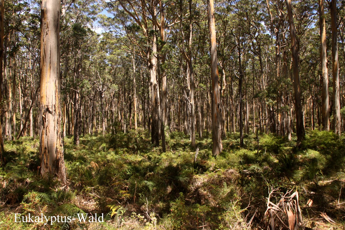So gestärkt machten wir uns auf die Reise. Im Ort tankten wir das Auto voll und fuhren dann um 11.45 h auf die Caves Road, eine Nebenstrecke, die durch herrliche Eukalyptus-Wälder nach Norden führt. |
