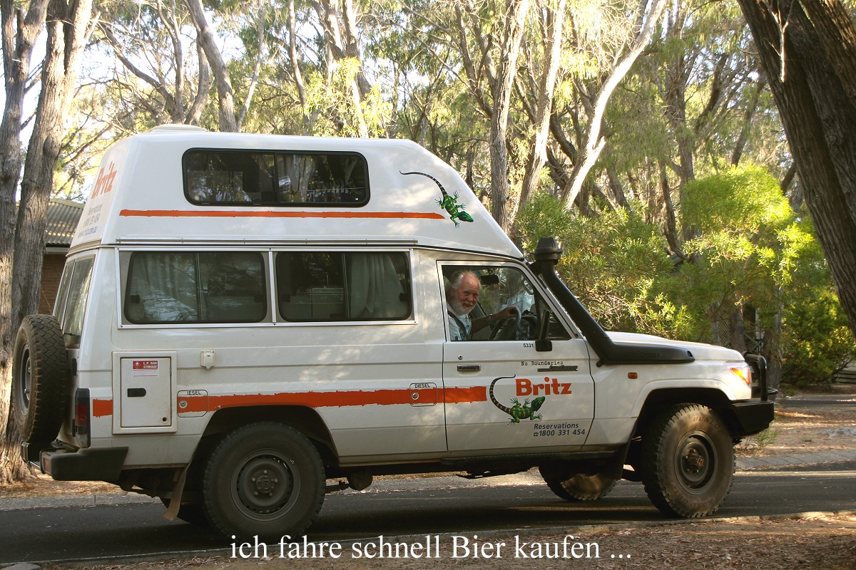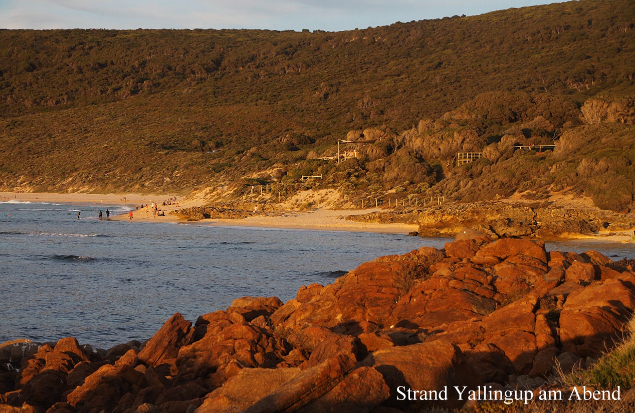 Anschließend suchten wir eine Möglichkeit für Internet. Ein in der Nähe gelegenes Cybercafé hatte um 13.00 h gerade geschlossen. An der Tür gab es einen Hinweis, dass man das WLAN auch draußen nutzen könne, das klappte aber nicht, als ich mein Netbook auspackte. Tomoko hatte inzwischen die gegenüberliegende Toilette aufgesucht. Auf dem Weg dorthin entdeckte sie zahlreiche Galahs in einem Baum. Bei dieser Gelegenheit möchte ich einmal ausdrücklich lobend die öffentlichen Toiletten in Australien erwähnen. Jeder kleine Ort verfügt über solche, die erstens sehr sauber und gepflegt und dazu noch kostenlos sind… Es war inzwischen sehr heiß geworden. Tomoko ging in den schön kühlen Supermarkt "COLES" und kaufte dort ein paar Lebensmittel, während ich die in der Nähe liegende Library aufsuchte um dort etwas im Internet zu stöbern. Das klappte aus unerfindlichen Gründen leider nicht, es kam keine Verbindung zustande… Etwas später kam Tomoko auch. Mit ihrem Laptop schaffte sie es nach 3 Versuchen, merkwürdig… Bevor wir weiterfuhren, wollte Tomoko noch Kuchen einkaufen. Da es bei "Brumby" keinen mehr gab, versuchten wir es am Ortsausgang in einer Bäckerei, aber auch dort war alles ausverkauft, vielleicht wegen des Wochenendes ? Schade…! Nun fuhren wir mitten durch das Weingebiet nach Norden. Ein Weingut folgte aufs andere. Inzwischen war es mit 36° sehr heiß geworden, gut dass es eine Klimaanlage gibt. Kurz nach 16.00 h erreichten wir Yallingup, eine kleine Ortschaft direkt am Meer. Der direkt am Strand gelegene Caravan-Park mit schönem Blick auf die Bucht war voll. Aber oben am Berg gab es einen zweiten Platz, wo wir noch einen schönen Stellplatz (Nr.10) für 40,- $!!! bekamen. Wir duschten zunächst beide, bevor Tomoko mit Kochvorbereitungen begann. Beim Kochen trank sie mit Entelchen das vorletzte Bier, wünschte sich aber noch mehr. |