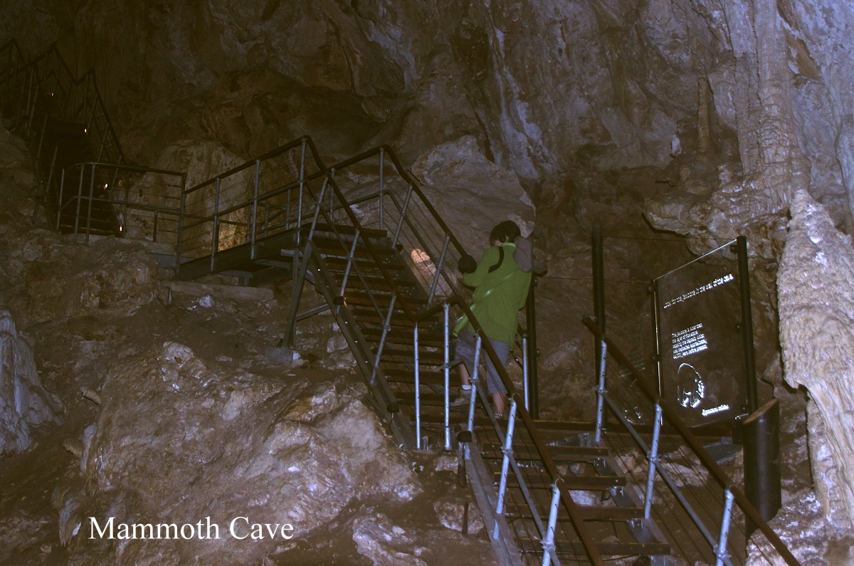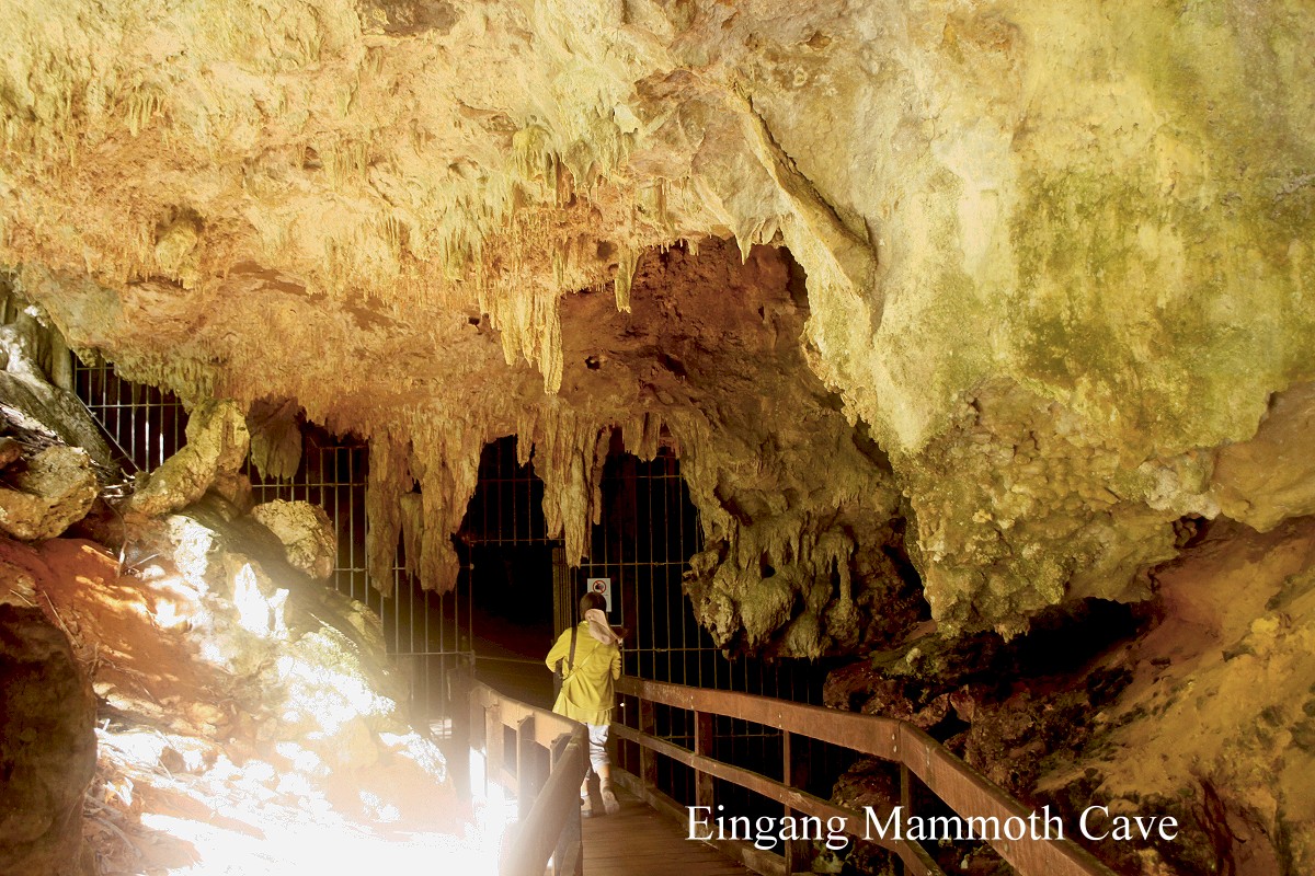 Um 8.30 h waren wir abfahrbereit. Am Ausgang des Campingplatzes warfen wir noch unsere Müllbeutel in einen dort abgestellten Container und fuhren los. Nach gut 20 Minuten erreichten wir schon unser erstes Ziel, Mammoth Cave, eine der sich in diesem Karstgebiet befindenden zahlreichen Höhlen. Wir hatten uns für die Besichtigung dieser Höhle entschieden, weil man diese auch ohne eine Führung begehen kann. Die Kasse hatte gerade um 9.00 h geöffnet und wir waren neben einem weiteren Paar die einzigen Besucher. Langsam wanderten wir auf einem festen schmalen Holzsteg durch das spärlich erleuchtete Labyrinth. |