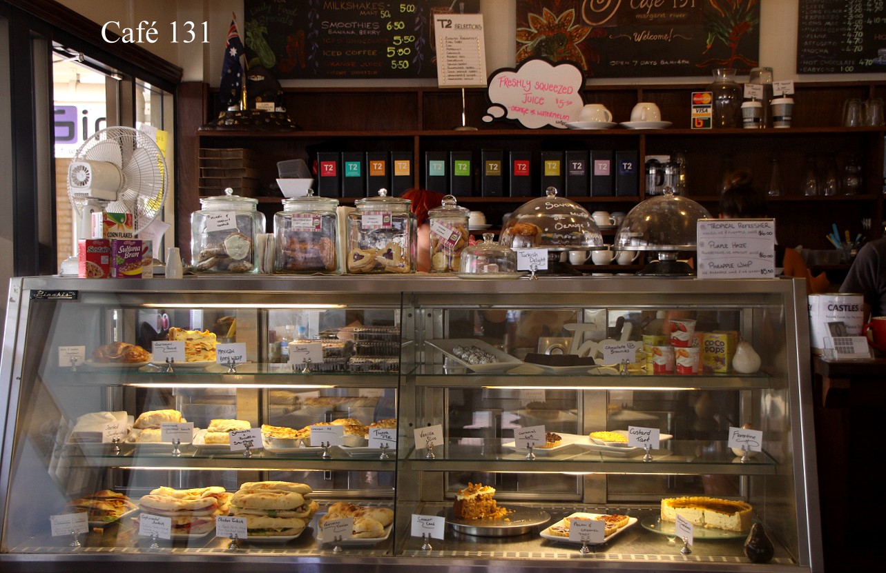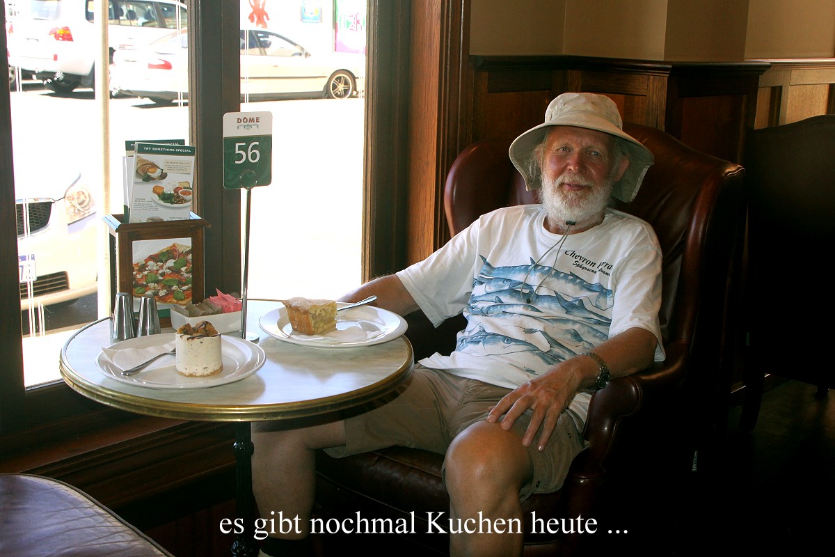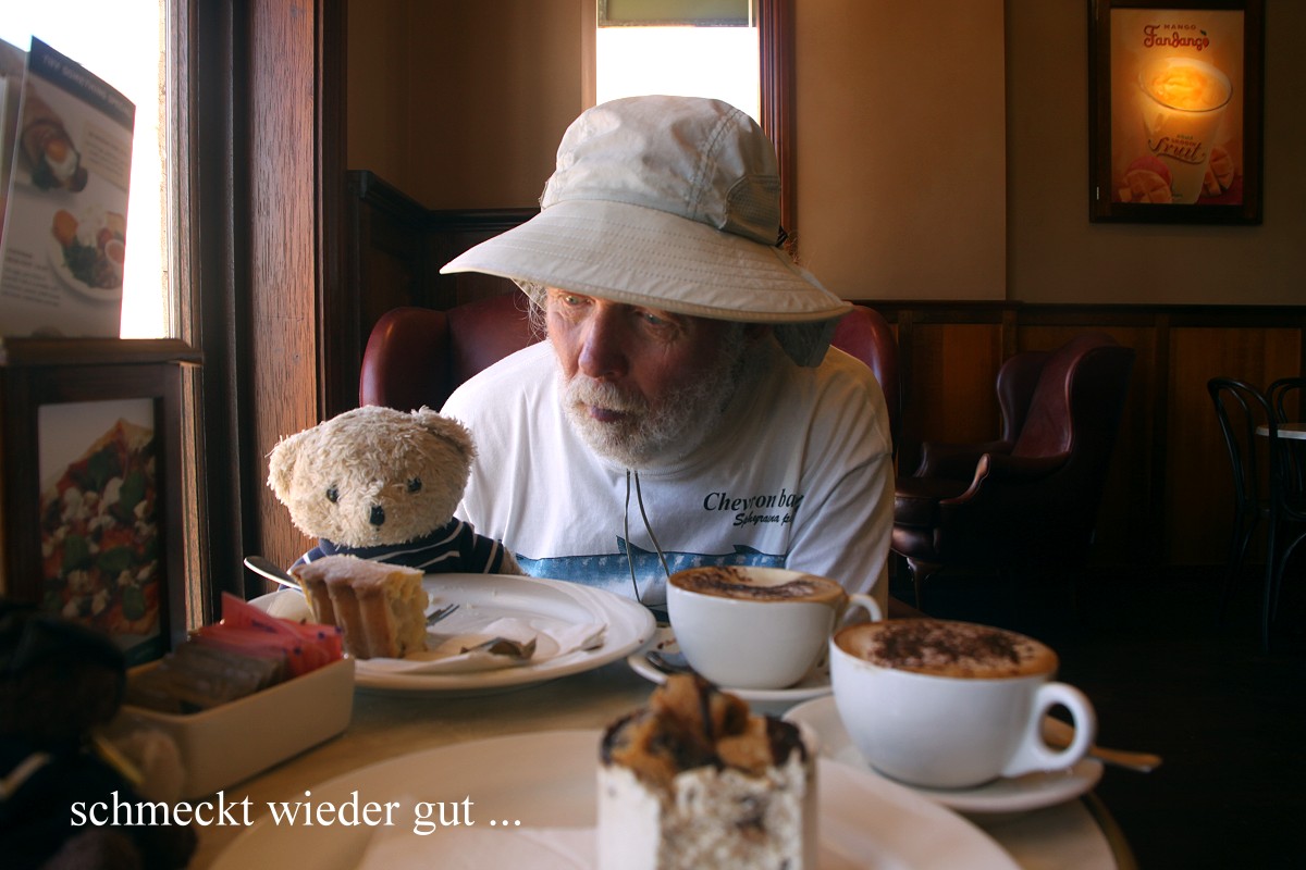 Um 12.10 h fuhren wir 10 km weiter nach Margret River, einem kleinen Städtchen, das Zentrum der hiesigen Weinbauregion. Am heutigen Samstag herrschte hier reger Verkehr, sowohl auf den Straßen als auch auf den Fußgängerwegen des Ortes. Wir fanden nach kurzer Suche einen Parkplatz und suchten zunächst mal nach einem Café. Wir entschieden uns für eins mit dem Namen "Café 131". Wir fanden so gerade noch draußen einen freien Tisch. Beide wählten wir ein Stück Passionfruit-Cheesecake mit einem Cappuccino. Der Kuchen hielt nicht ganz, was sein Name versprach, ziemlich säuerlich, und mit 18,- $ auch nicht gerade preiswert. Die Bären waren trotzdem zufrieden. |