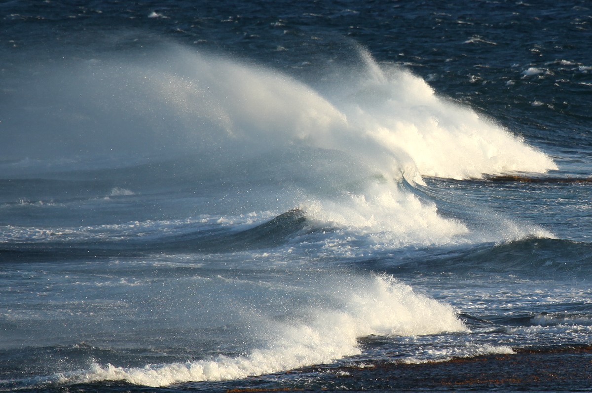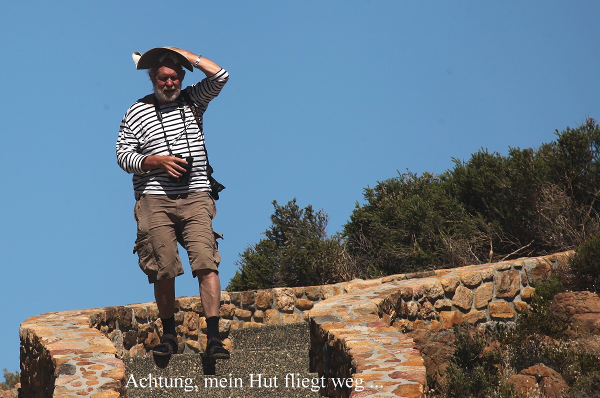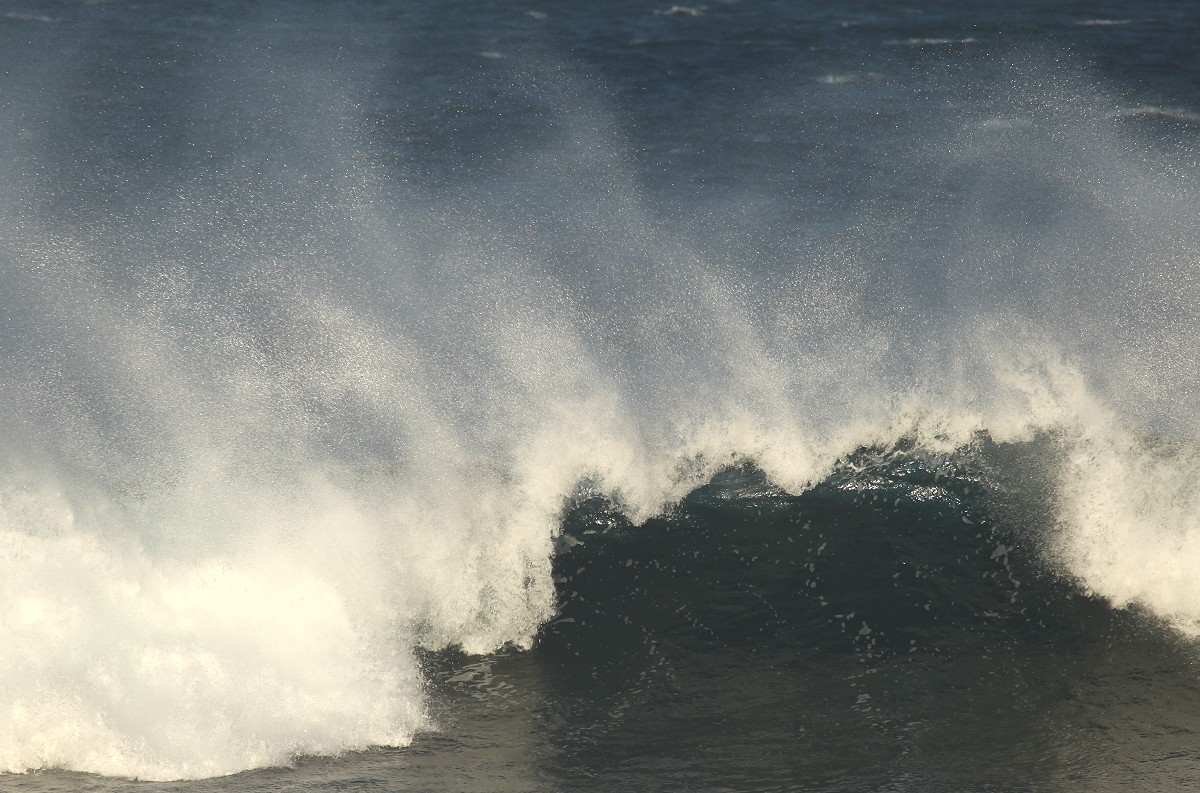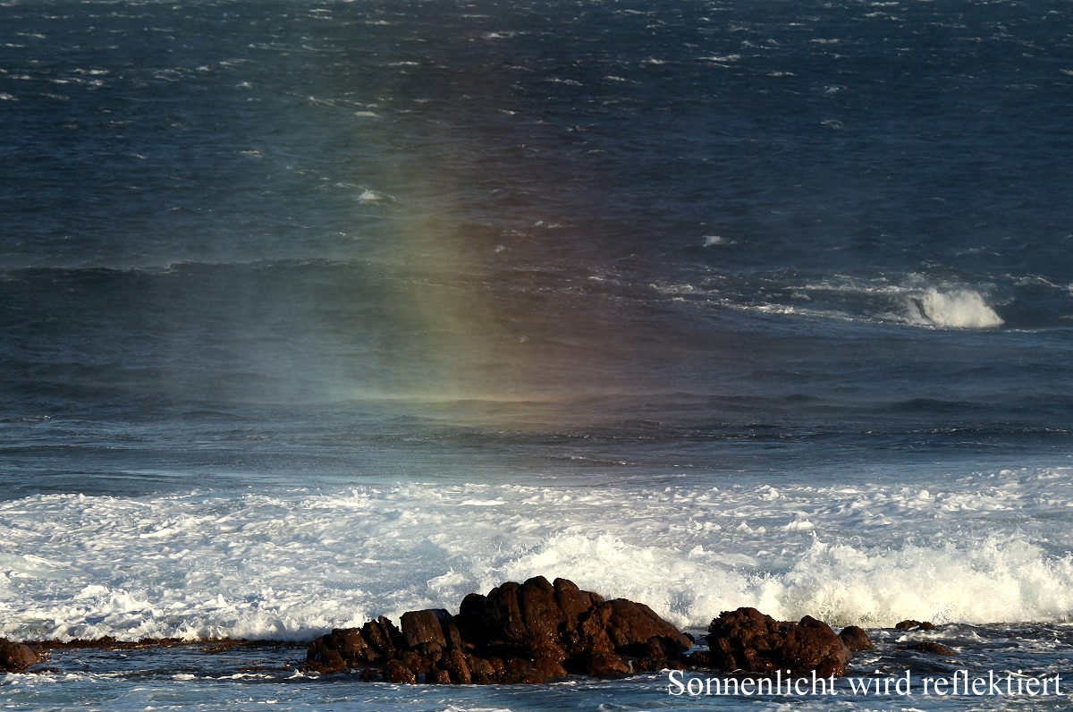 Auch jetzt war die Brandung wieder gewaltig und da der scharfe Wind den Wellen entgegen blies, spritzte die weißschäumende Gischt meterhoch und im Licht der noch tiefstehenden Sonne konnte man manchmal kleine Regenbögen erkennen. |