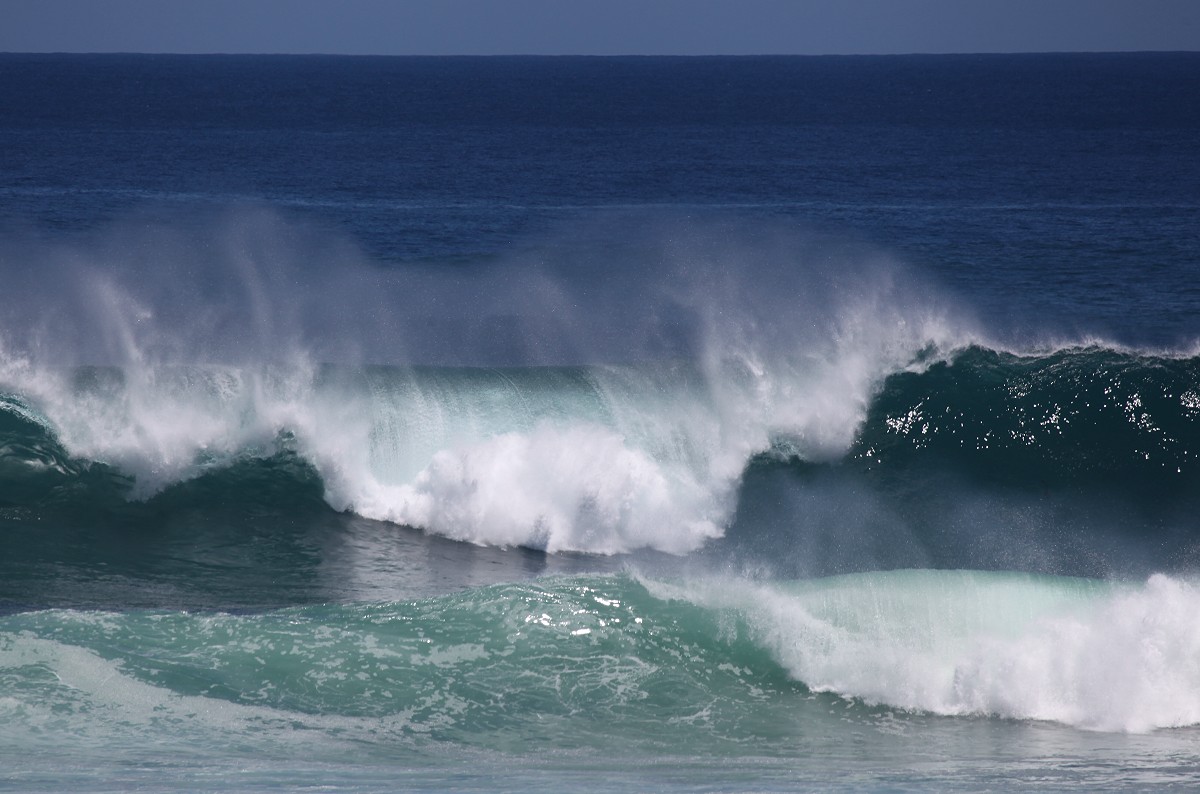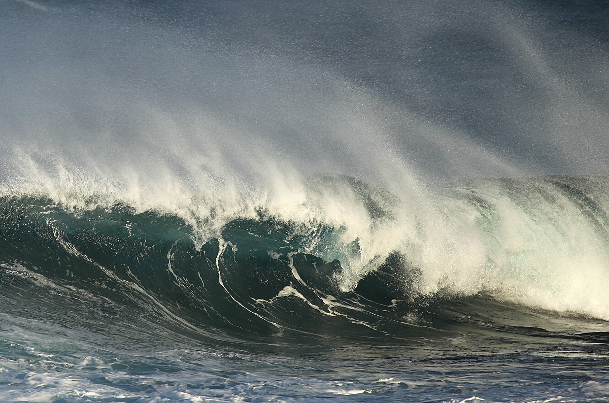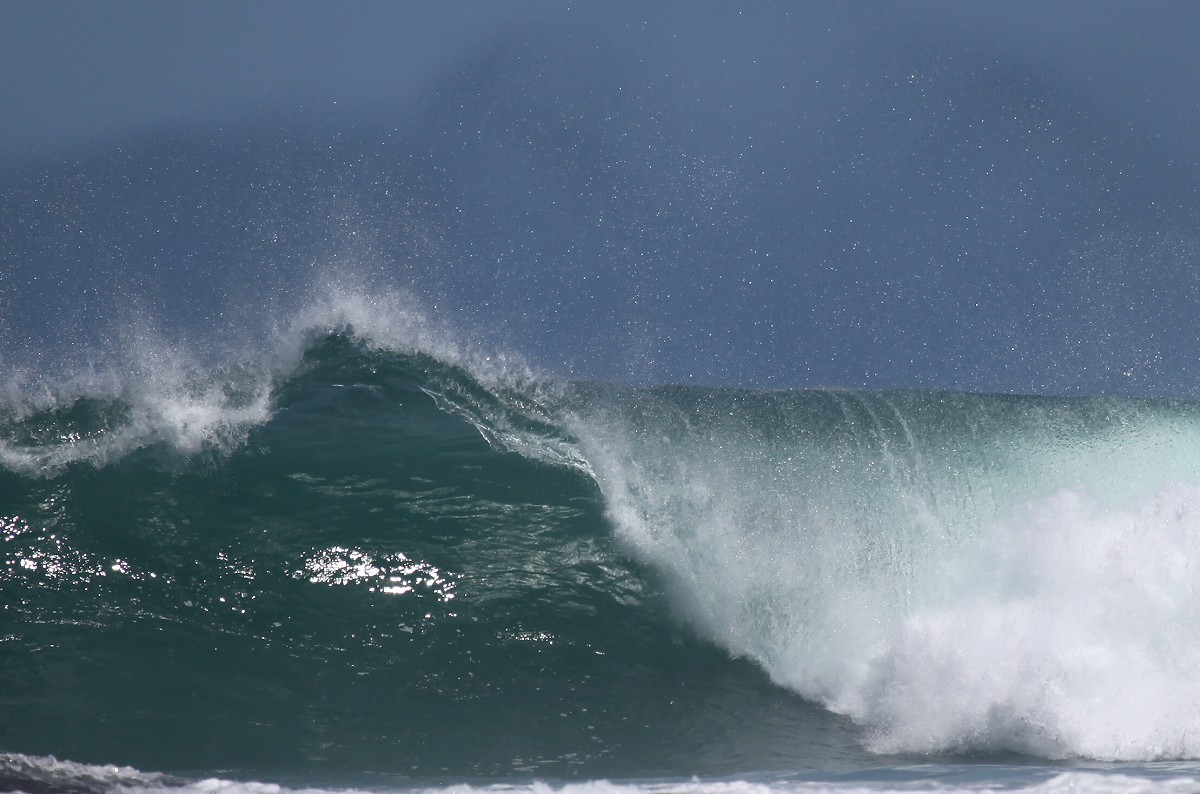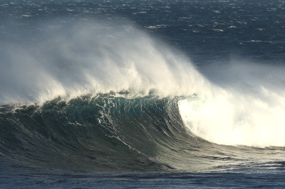 Auch jetzt war die Brandung wieder gewaltig und da der scharfe Wind den Wellen entgegen blies, spritzte die weißschäumende Gischt meterhoch und im Licht der noch tiefstehenden Sonne konnte man manchmal kleine Regenbögen erkennen. |