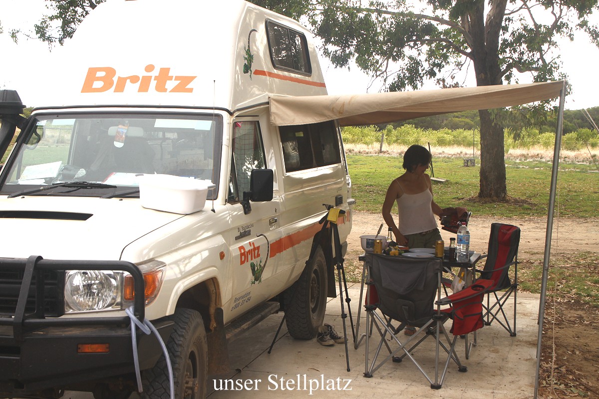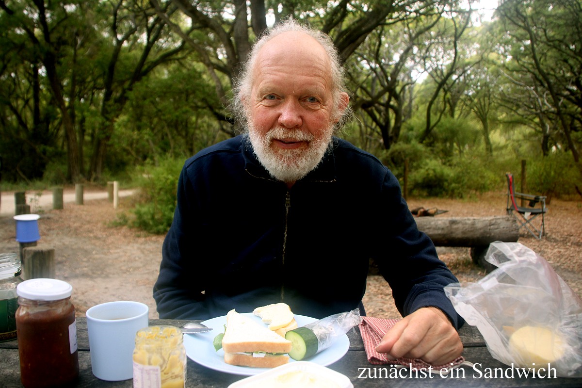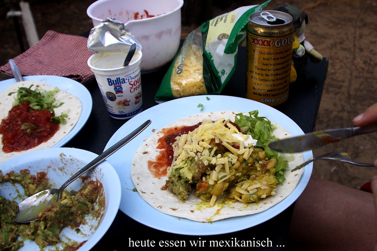 So bequem habe ich in meinem ganzen Leben noch nie in einem Café gesessen. Wir wollten gar nicht mehr aufstehen, aber die Sorge, vielleicht keinen schönen Platz zum Übernachten mehr zu finden, veranlasste uns schließlich doch zu gehen. Wir hatten aber Glück und erhielten den gleichen Stellplatz wie gestern. Das war um 15.45 h. Der Campingplatz war wesentlich leerer. Viele Gäste, die nur über das Wochenende aus Perth und Umgebung angereist waren, waren schon wieder auf dem Heimweg. Ich nutzte unseren Wasseranschluss und nahm erst mal eine erfrischende Dusche aus dem Wasserschlauch neben unserem Auto. Tomoko fing schon mit den Vorbereitungen zum Abendessen an, während ich mit meinem Tagebuch begann. Zwischenzeitlich duschte Tomoko auch. Um 17.30 h war das Essen fertig. Diesmal gab es Wraps mit mexikanischen Zutaten wie Tomaten-Salsa-Sauce, Guacamole, Bohnenpürree, Cheddar Käse und Sour Cream. Die Schärfe war genau richtig. Gut, dass wir vorher die Chilischote auf ihre Schärfe gecheckt hatten. Sie war richtig scharf, so dass Tomoko nur ein kleines Stück unter die Tomaten mischte. Ein kühles Bier schmeckte bei der immer noch großen Hitze toll dazu. Während wir aßen, sah Tomoko plötzlich, wie eine Maus aus einem Abflussrohr neben unserem Stellplatz herausschaute, niedlich ... |