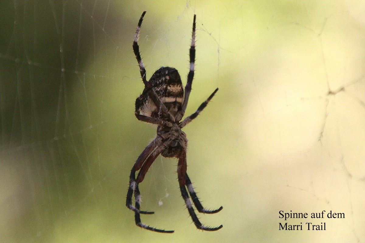 Oben in der inzwischen ziemlich warmen sonnigen Umgebung angekommen, entschieden wir uns, nicht direkt zum Parkplatz zurückzugehen, sondern einen kleinen Umweg über den 700 m langen Marri Trail zu machen. Unter hohen dichtbelaubten Bäumen genossen wir nach der Enge in der Höhle die frische Luft in freier Natur. Am Rande des Trails konnten wir eine große Spinne in ihrem Netz sitzen sehen. Am Parkplatz angekommen verspürten wir Hunger. Tomoko holte die Reste des gestrigen Abendessens aus dem Auto. An einem Tisch nahmen wir auf einer Bank Platz und stärkten uns ein wenig. |