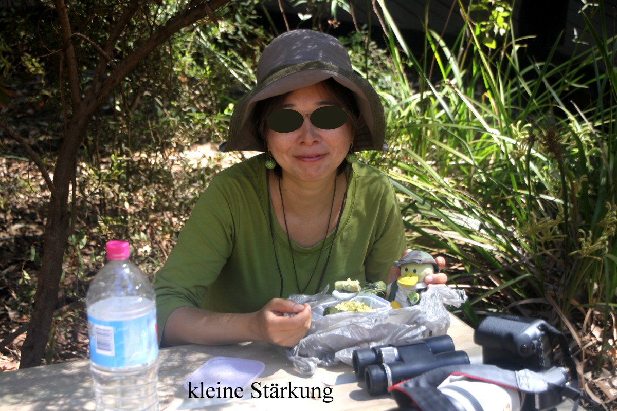 Heute ließen wir es ganz geruhsam angehen und standen erst gegen 6.00 h auf. Die Lufttemperatur war mit 17° relativ kühl. Unser Frühstück fiel heute wieder recht opulent aus. Da wir ja keinen Strom für den Toaster hatten, machte Tomoko außer Sandwiches in der Pfanne wieder French Toast, die Luxusvariante mit einem Patsch Sahne, hmm lecker…! Viele Vögel ließen sich sehen: Australian Raven, Magpie, Western Yellow Robin, White-breasted Robin, Red-winged Fairy-wren, Grey Fantail mit Kind, New Holland Honeyeater, Inland Thornbill. |