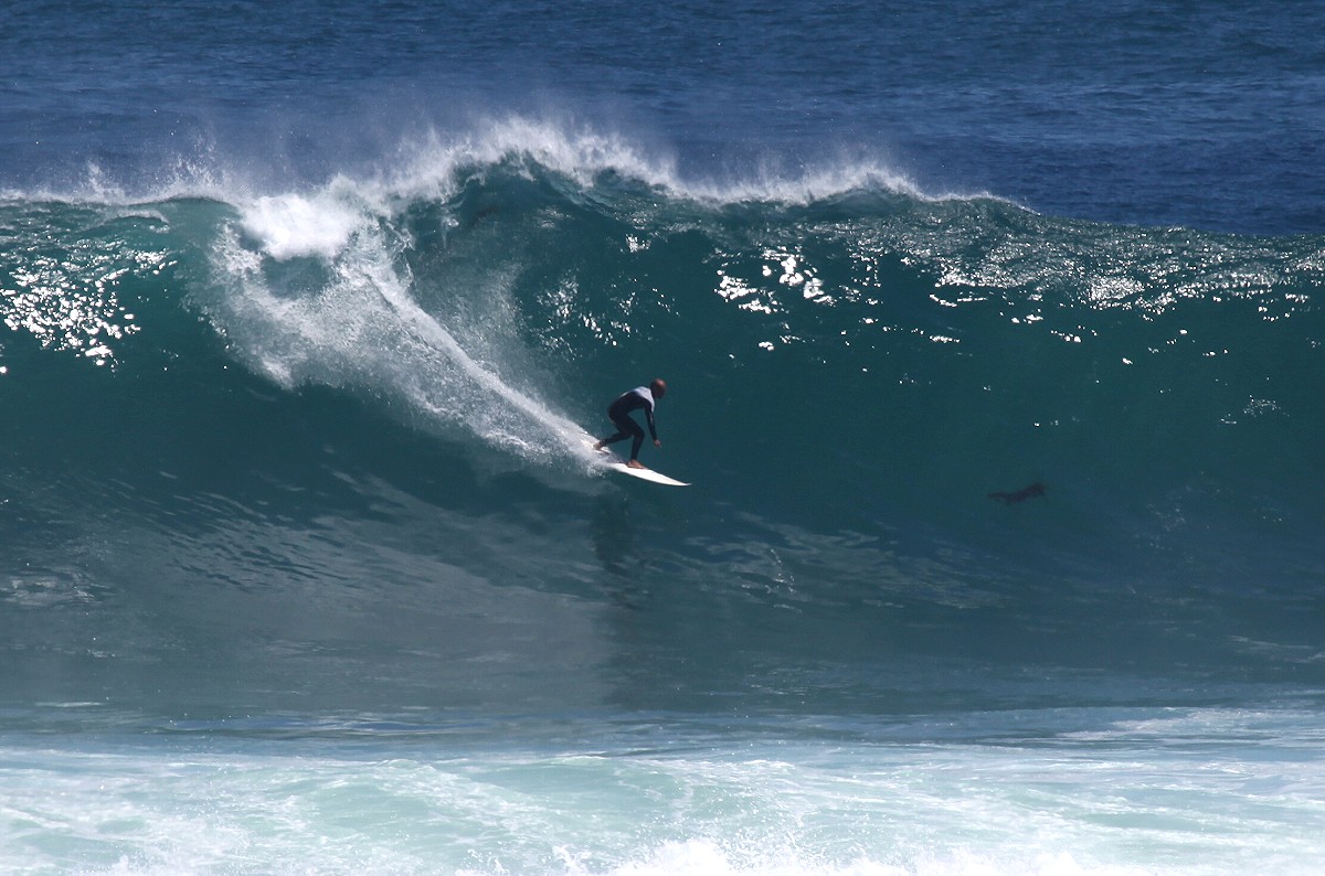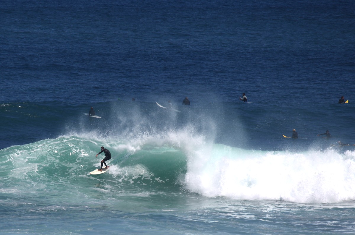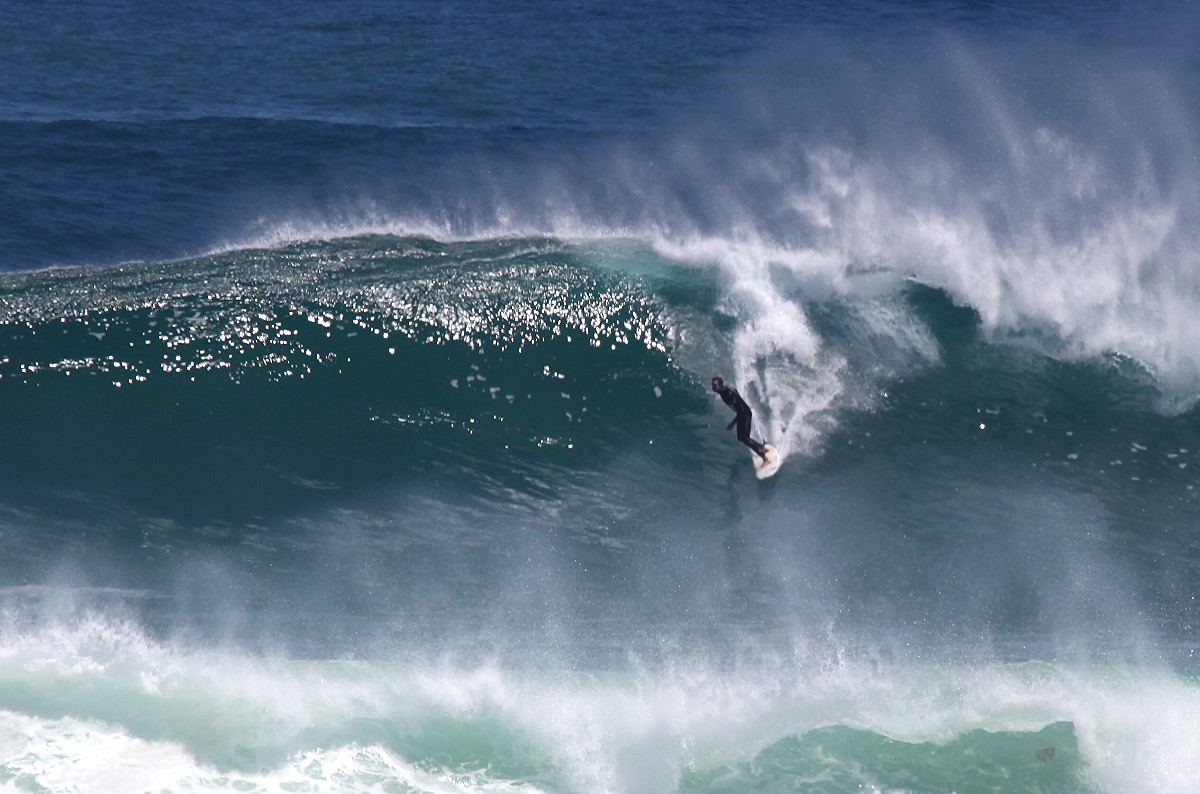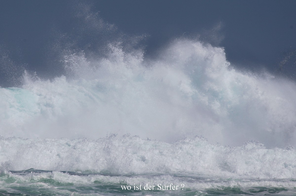 Von einem Parkplatz 30-40 m über dem Meer konnten wir beobachten, wie zahlreiche Surfer in der Brandung mit ihrem Surfbrett auf die nächste Riesenwelle warteten, sich blitzschnell aufrichteten und auf der Welle dahinglitten. |