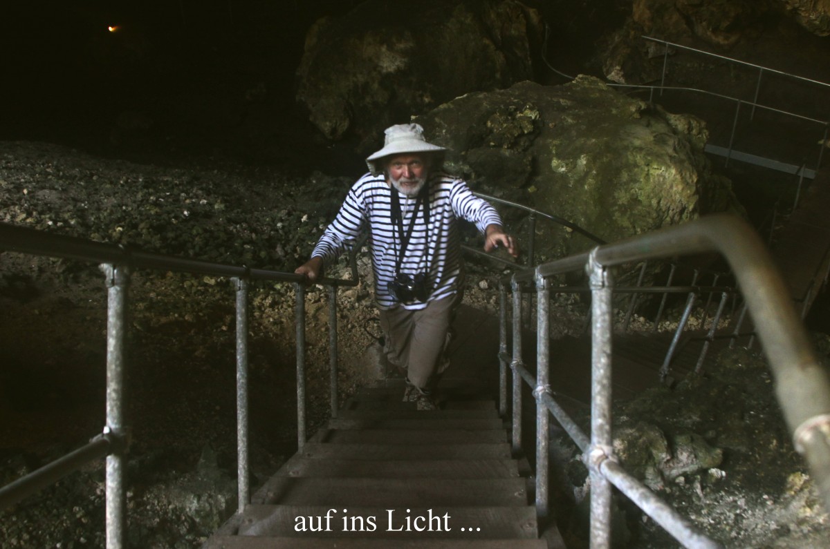 Ich hatte zur Sicherheit meine Taschenlampe eingesteckt, man weiß ja nie… Immer wieder waren kurze steile Treppen zu bewältigen und es gab immer neue faszinierende Ausblicke auf die zahlreichen Jahrmillionen alten Stalaktiten und Stalagmiten. Es war ziemlich feucht und kühl in der Höhle. Etwa eine Stunde dauerte unsere Wanderung, die am Ende über eine 160-stufige steile Treppe wieder ans Tageslicht führte. |