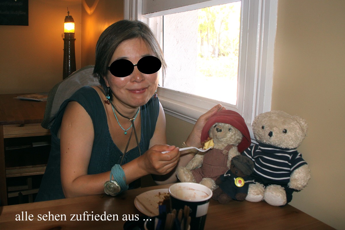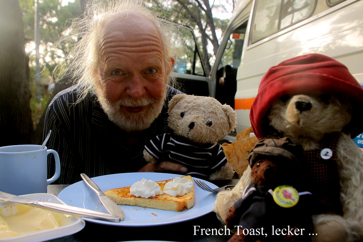 Heute wachten wir für unsere Gewohnheit ziemlich spät auf, erst um 6.30 h. Es war schon taghell und die Sonne schien. Über Nacht war es auf 23° abgekühlt, sehr angenehm. Zum Frühstück gab es heute u.a. wieder French Toast, worüber unsere Bären sich sehr freuten. |