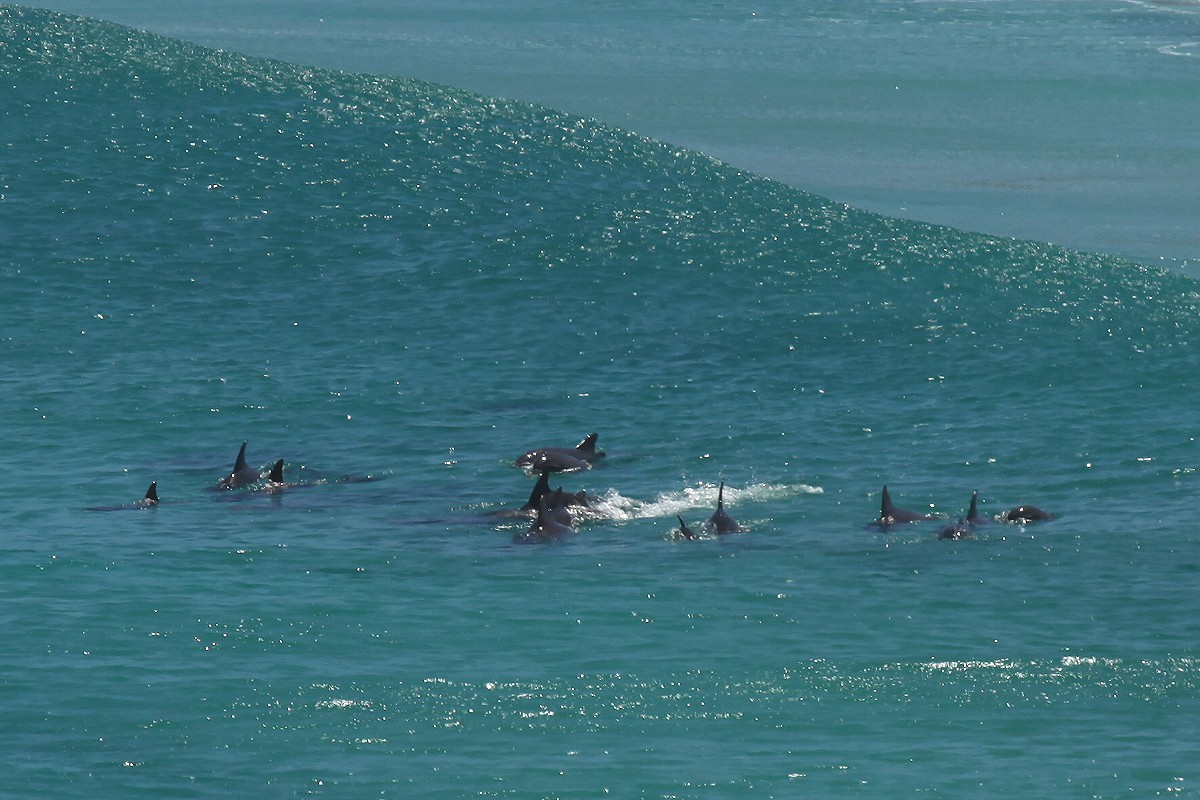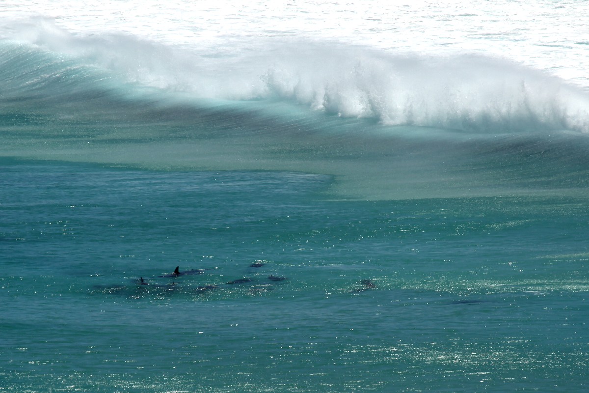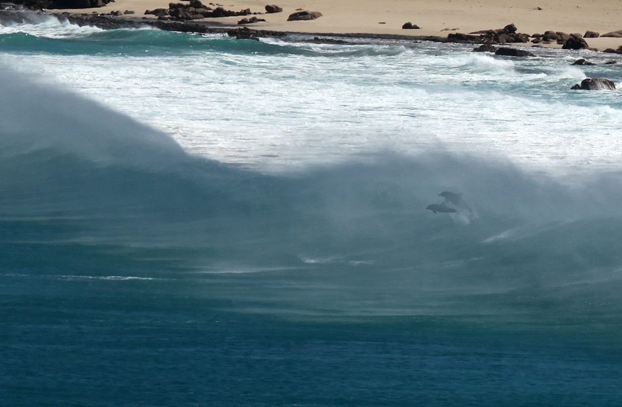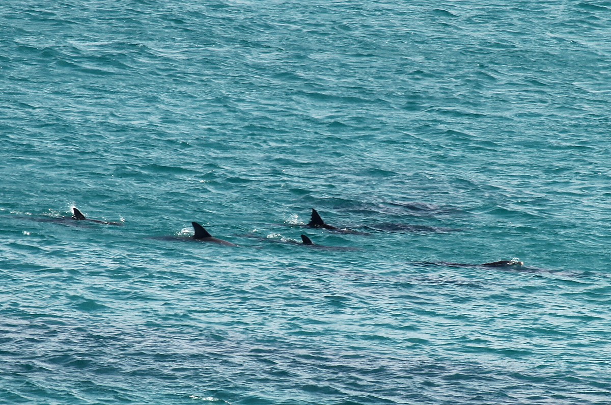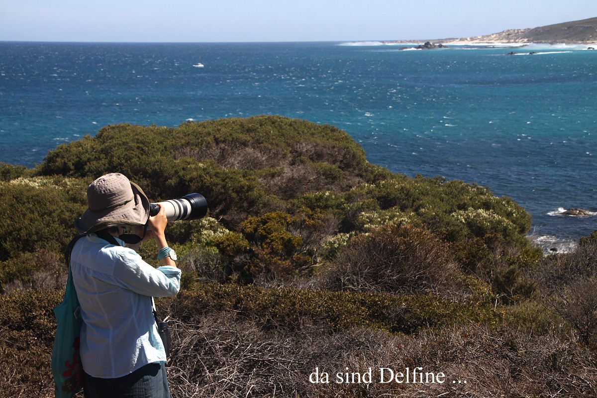 Hier ließen wir uns auf einer kleinen Steinmauer nieder. Plötzlich hatte Tomoko etwas im Meer entdeckt, ja tatsächlich, dort schwammen einige Delfine, mindestens 7 Exemplare, in der Brandung herum. Mit unseren Ferngläsern konnten wir beobachten, wie sie munter im Wasser sich bewegten, manchmal die heranrollenden Wogen elegant überspringend. |