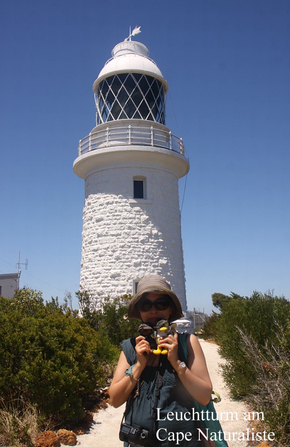 Unser nächstes Ziel war der Leuchtturm von Cape Naturaliste. Für 4,- $ pro Person konnten wir ein wenig auf dem Gelände herumspazieren. Gleich am Eingang stand ein Schild, dass man heute Schlangen gesehen hatte und mahnte zur Vorsicht, na ja… Der Leuchtturm selbst war nicht besonders hoch. Wir umrundeten ihn einmal, doch die Temperatur war inzwischen auf 33° gestiegen, wobei es auf dem schattenlosen Gelände noch wesentlich heißer war. Es gab auch außer einem kleinen Fantail und einem Wren kein Vögelchen zusehen. Somit gingen wir zum Eingang zurück. Dem dortigen kleinen Museum ist ein kleines Café angeschlossen. Dort kaufte ich mir ein Eis, Tomoko ein Stück Carrot-Cake und einen Cappuccino. Gemütlich setzten wir uns damit an einen kleinen Tisch und verschnauften ein wenig. |