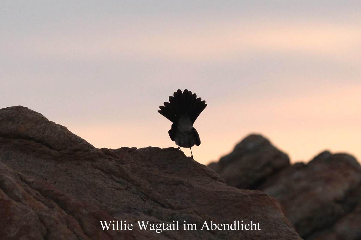 Auf einem Felsen nahmen wir Platz und schauten zu, wie das Licht allmählich schwächer wurde. Ein Willie Wagtail hüpfte vor unseren Augen herum. |