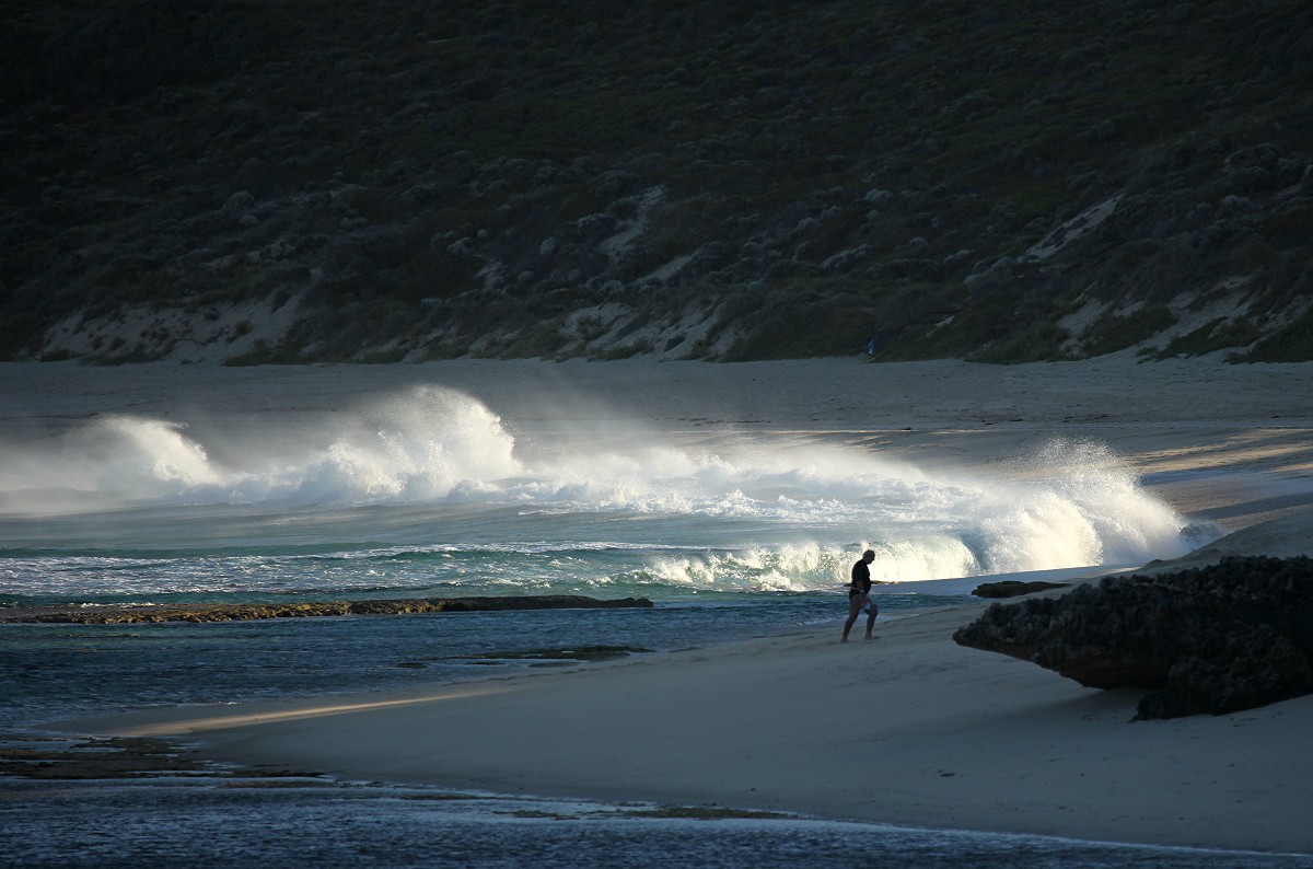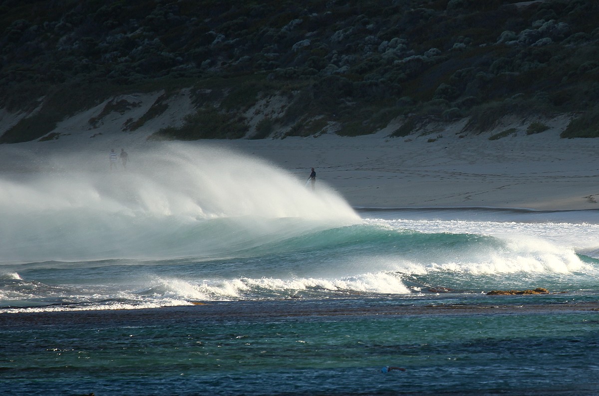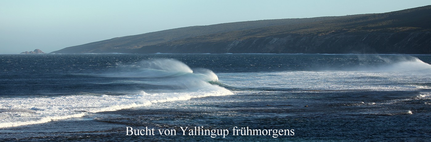 Um 10.50 h fuhren wir weiter. Nach wenigen km erreichten wir die Abzweigung nach Prevelly Beach, wo wir nach weiteren 4 km ankamen. Prevelly Beach ist unter Surfern weltweit bekannt wegen seiner grandiosen Riesenwellen. Was wir sahen war in der Tat großartig. |