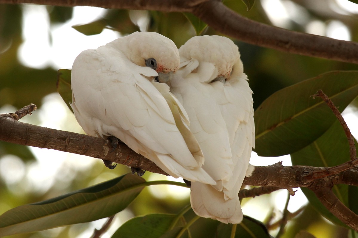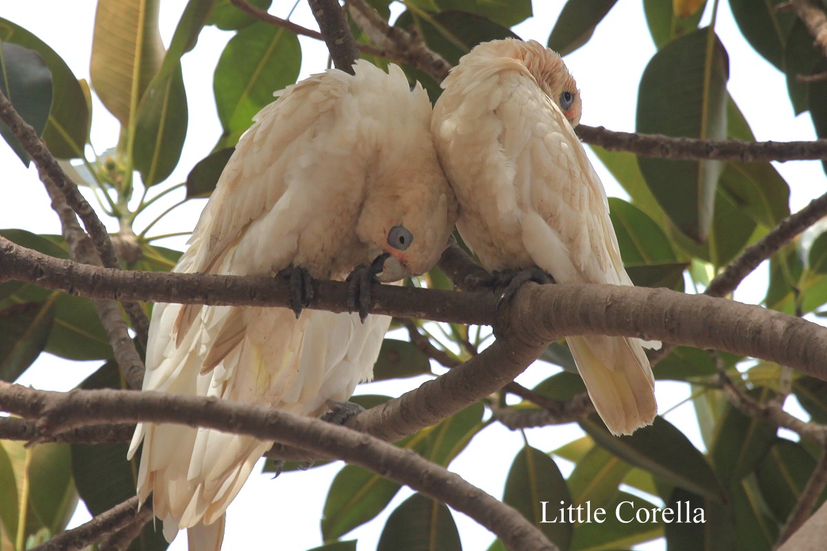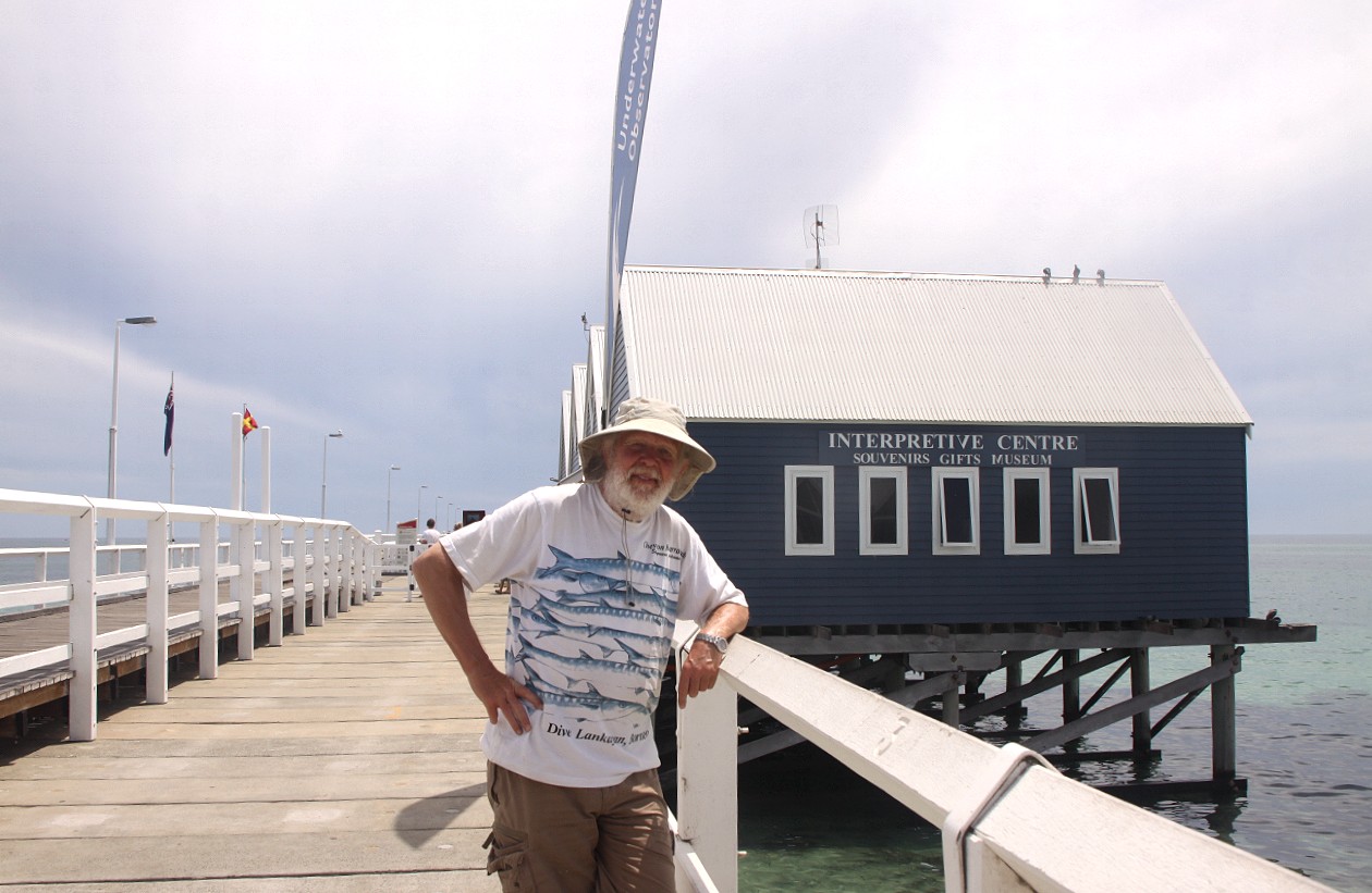 Inzwischen wurde es immer heißer, so dass wir die Klimaanlage einschalten mussten. Um 11.00 h erreichten wir Busselton, eine touristisch sehr entwickelte Stadt an der Geographe Bay. Hier suchten wir zunächst einen Parkplatz, was auf Grund des starken Verkehrs gar nicht so einfach war. Ein Woolworths- Supermarkt war in der Nähe, wo wir ein paar Dinge einkauften. Vor allem unsere Wasservorräte schmolzen in der Hitze dahin. Inzwischen war es 36° heiß, so dass uns der klimatisierte Supermarkt sehr willkommen war. Anschließend besuchten wir gegenüber eine Bäckerei, die mir aufgefallen war. Mein Bienenstich schmeckte gut, Tomokos Apple Custard weniger. Überhaupt war das ganze nicht gemütlich mit Pappbechern, ohne Teller… Direkt gegenüber hatte Tomoko ein viel besseres Café gesehen, da ich mir aber so sicher war, etwas Gutes gefunden zu haben, sagte sie nichts. Nun ja, zu spät…Wir schauten uns noch den Strand an. Hier geht ein langer Steg (Jetty) 1.837 m weit ins Meer, nur befahrbar mit einem kleinen Bähnchen. Dort am Ende befindet sich ein Unterwasserobservatorium. Dorthin fuhren wir aber nicht, es war einfach zu heiß, obwohl der Himmel inzwischen ziemlich wolkenverhangen war. Beim Weg zur Toilette entdeckte Tomoko neben dem Strand zahlreiche Papageien (Little Corellas) in einem Baum sitzen. |