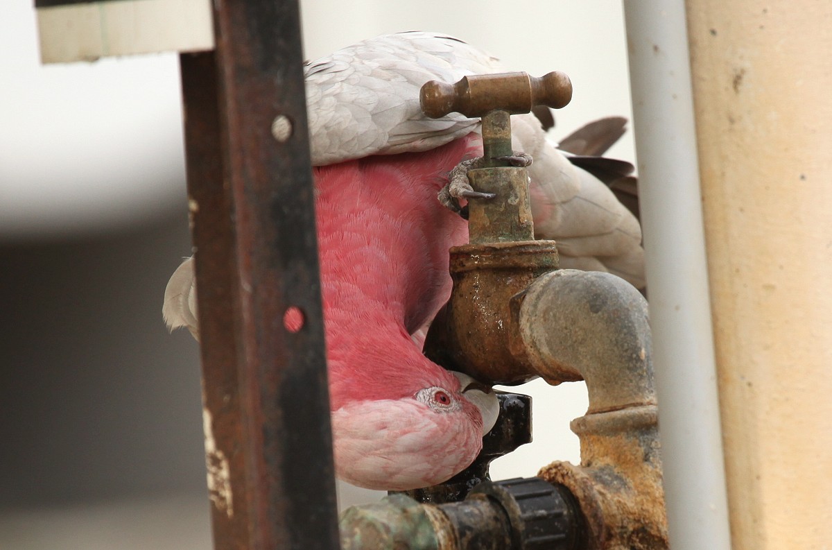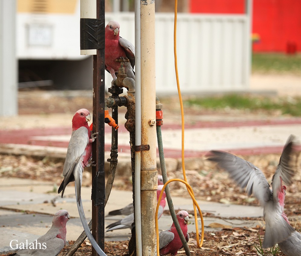 Um 12.30 h fuhren wir weiter Richtung Bunbury. Diese Stadt streiften wir nur im Vorbeifahren, wobei wir natürlich keinen richtigen Eindruck bekamen. Einige km weiter nördlich wollten wir uns einen Campingplatz zum Übernachten suchen. Der erste in Billingup machte einen trostlosen Eindruck. Wir hatten ihn nur mit großer Mühe gefunden, keinerlei Hinweisschilder innerhalb des Ortes. Der Ort selbst wirkte wie ausgestorben, nur zahlreiche Papageien saßen auf den hohen Antennen der umliegenden Häuser. Schnell fuhren wir weiter einige km bis zum nächsten Ort Myalup . Doch auch dieser Platz gefiel uns nicht. Das scheint ja ein Problem heute zu werden. Wir fuhren weiter bis zum Lake Clifton. Hier wurden wir endlich fündig. Ein schöner Platz etwas abgelegen im Yalgorup NP, aber sauber und ziemlich leer. Wir installierten uns am äußersten Rand und bekamen bald Besuch von zahlreichen Papageien. Zunächst kamen Galahs in großer Zahl, die versuchten aus verschiedenen tropfenden Wasserhähnen Wasser zu trinken. |