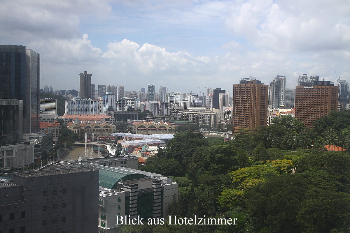 Anschließend gingen wir langsam wieder zurück zum Hotel. Wir packten unser Gepäck fertig, Tomoko nahm noch ein Bad und um 11.45 h gingen wir zur Rezeption und checkten aus. Da unser Flug nach Frankfurt ja erst um 23.55 h, also gegen Mitternacht, startet, gaben wir unser Gepäck beim Bell-Captain ab und machten uns auf den Weg Richtung Somerset, wo Tomoko ein japanisches Café vorgestern gesehen hatte, das sie gerne besuchen wollte. Es regnete leicht. Tomoko hatte einen Schirm, mir war die leichte Abkühlung durchaus willkommen, ich schützte nur meine Kamera mit einer Plastiktüte. Wir wanderten zunächst zum Singapore-River, dann am Ufer etwas entlang, kamen jedoch nicht allzu weit, da eine Baustelle den weiteren Weg versperrte. Wir mussten ein Stück zurückgehen. |