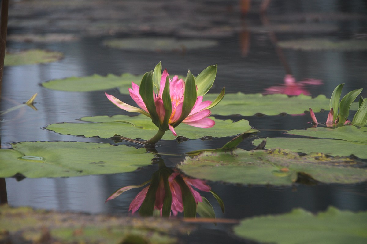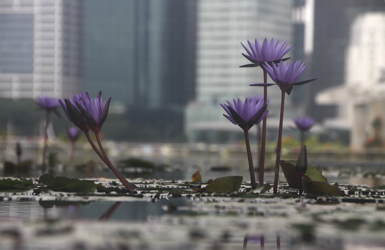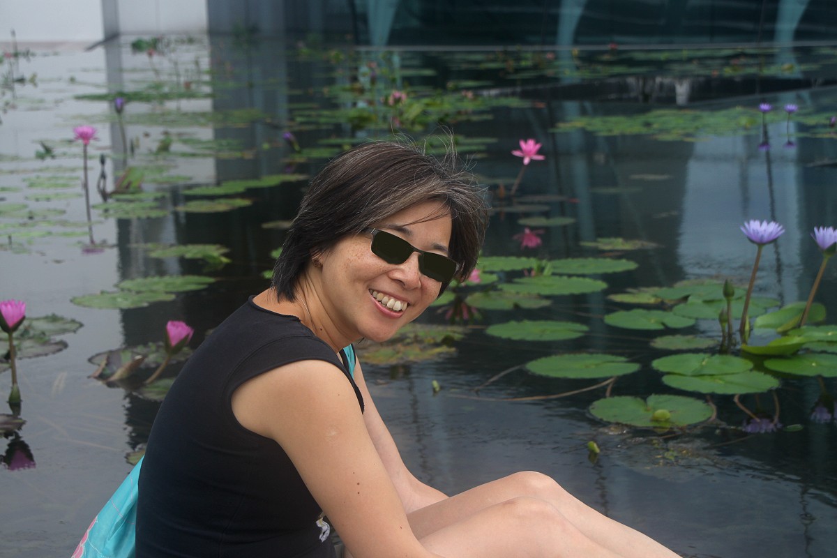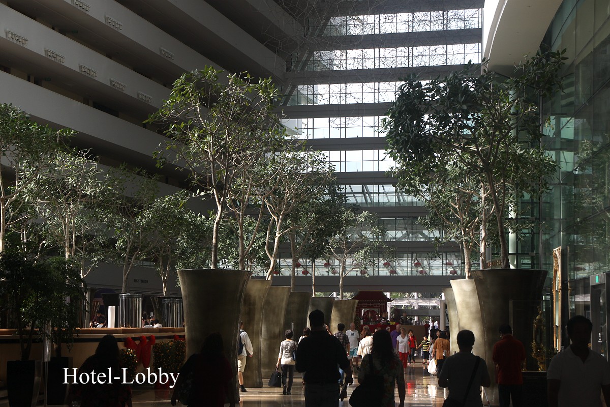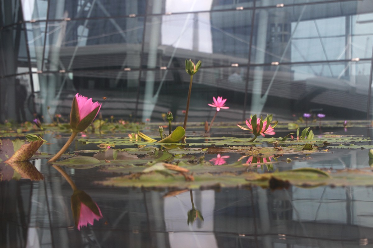 Es war ziemlich warm, die Sonne schien, wurde aber hin und wieder von dicken Wolken verdeckt. Wir waren bei guter Kondition und erreichten bald das Hotel. Das Gebäude ist noch ziemlich neu (Eröffnung 2010) und ist schon ziemlich beeindruckend. Wir machten etliche Fotos von den Außenanlagen, wo in künstlich angelegten Teichen Wasserpflanzen mit farbenprächtigen Blüten wachsen. |