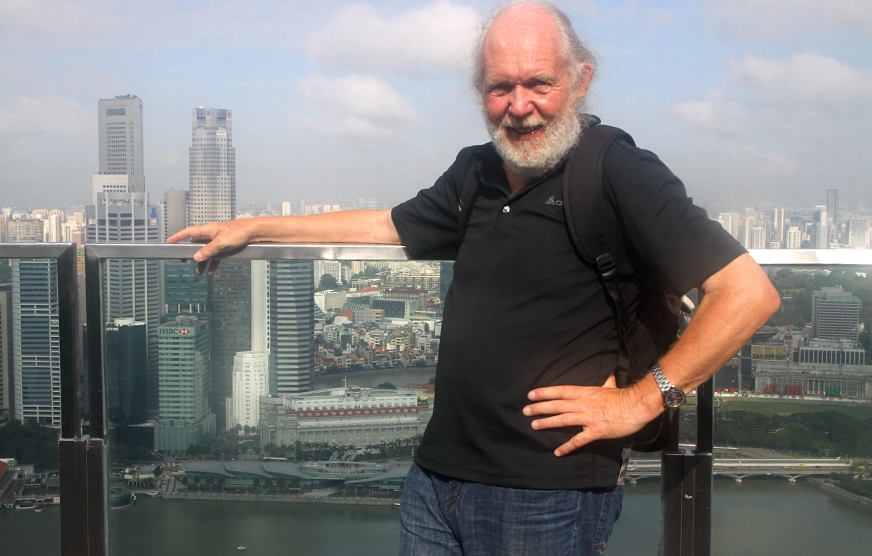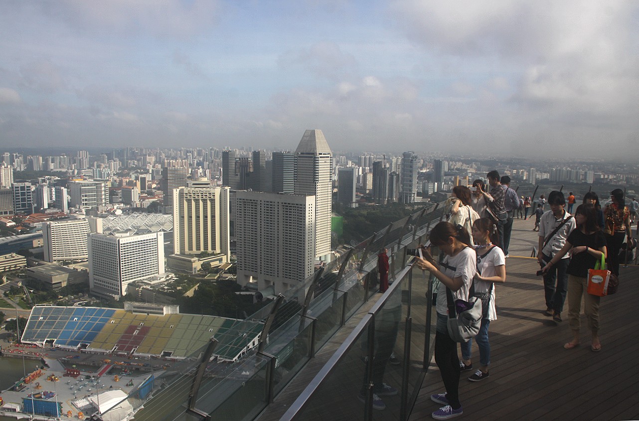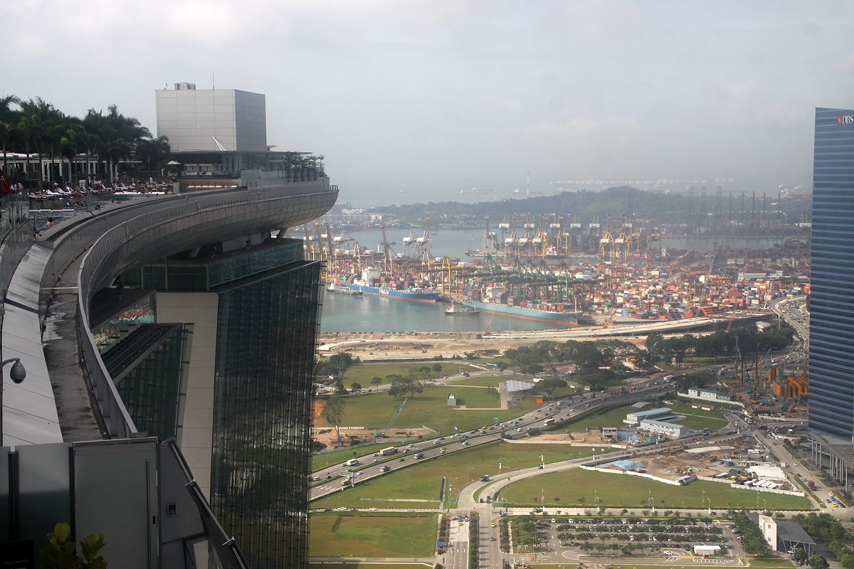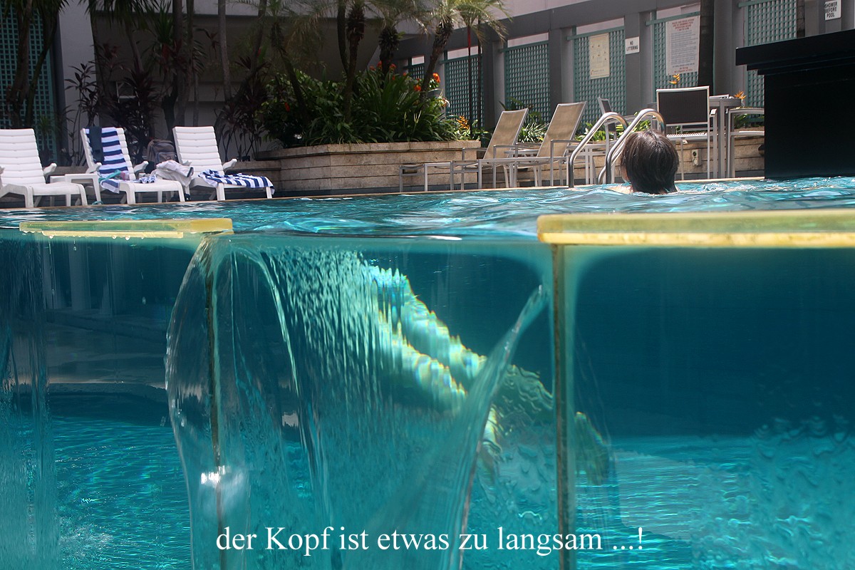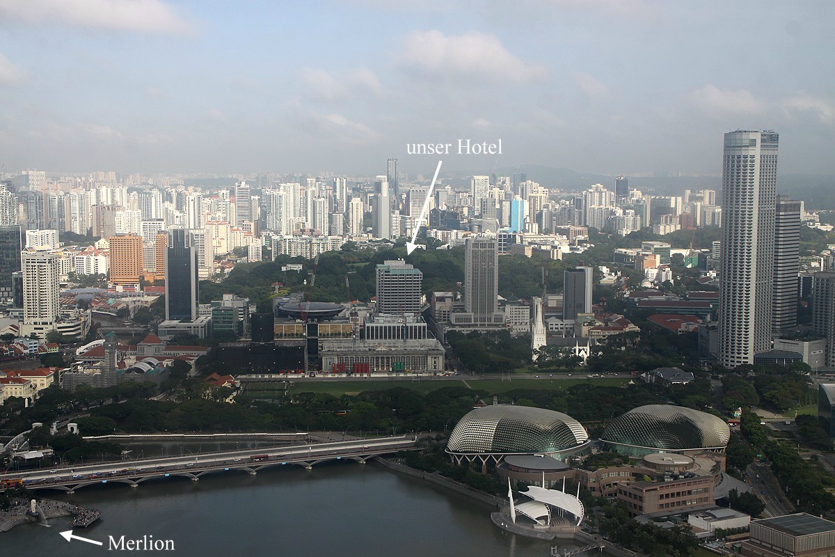 Da Tomoko nicht an einer Besichtigung interessiert war, fuhr sie schon mit der U-Bahn zur Orchard Road, wo wir uns um 11.00 h treffen wollten. Es war gerade 9.30 h, als die Kasse öffnete, wo man Tickets (20,- SIN$) für den "Skywalk" kaufen konnte. Ich war einer der ersten der mit einem Express-Aufzug zur 57. Etage hochfuhr. Die Aussicht von hier oben verschlug mir fast den Atem. Ich machte etliche Fotos in alle Richtungen, einmalig diese Aussicht… Besonders verrückt fand ich, dass hier in luftiger Höhe ein riesiger 147 m langer Swimmingpool existiert, der schon gut von Hotelgästen genutzt wurde. |