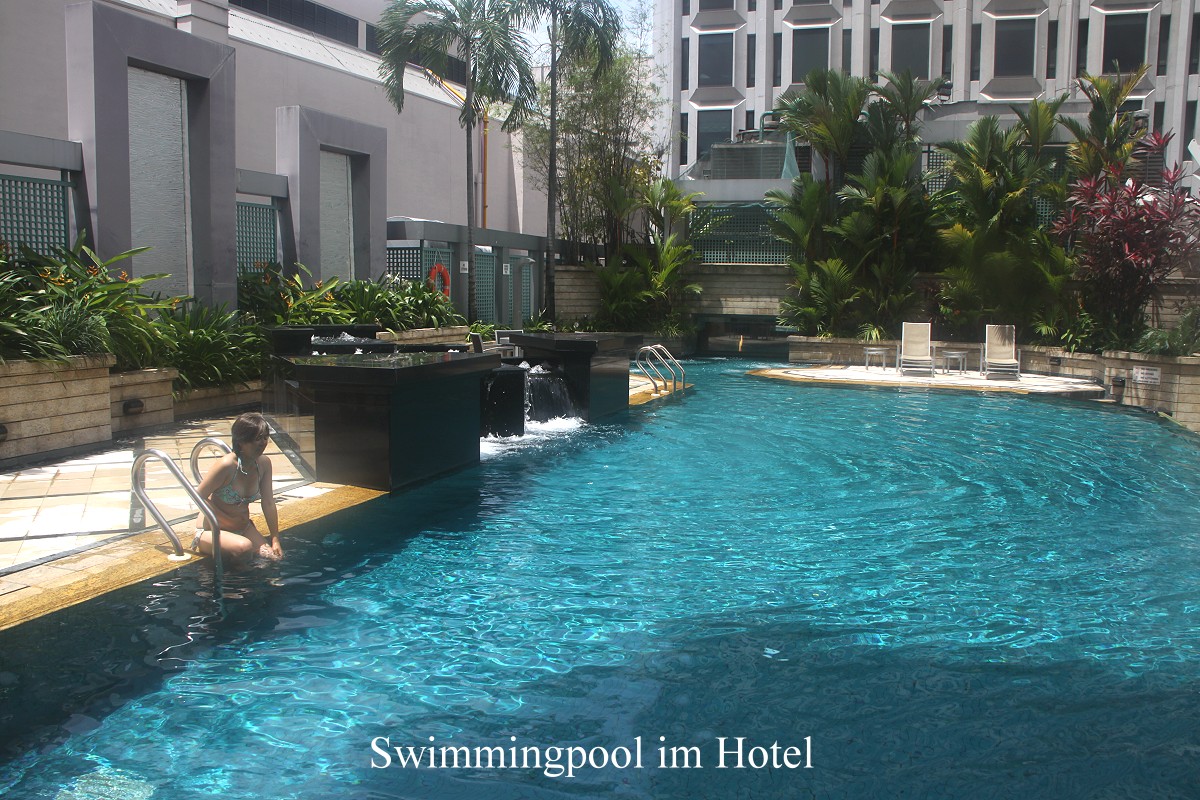 Im Anschluss daran gingen wir wieder ein Stück zu Fuß in Richtung unseres Hotels. Da es heute jedoch wesentlich wärmer und schwüler war als gestern, stiegen wir an der Station Somerset in die U-Bahn und fuhren damit zurück zum Hotel. Dort besuchten wir beide den Swimmingpool des Hotels. |