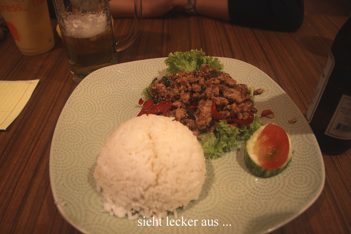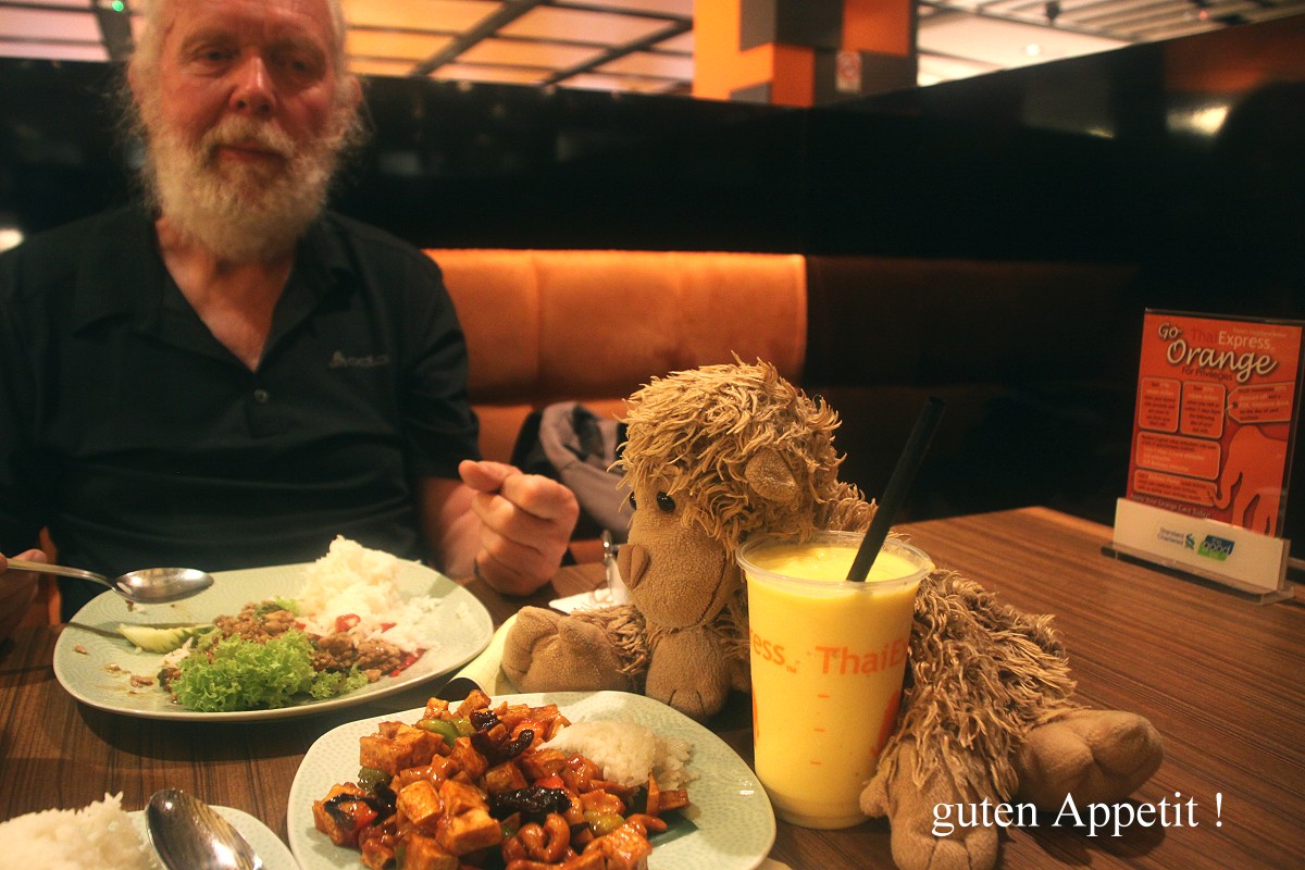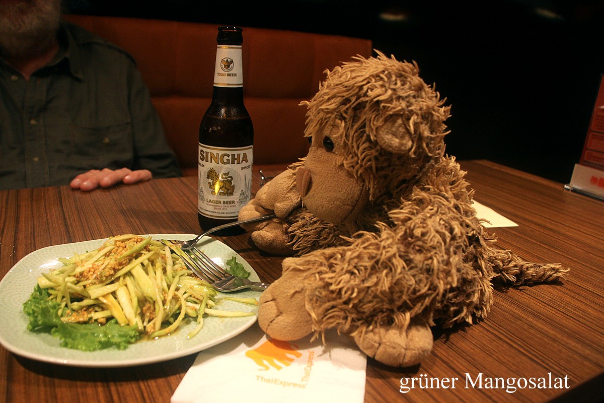 Im Thai-Restaurant angekommen bestellte Tomoko einen grünen Mangosalat mit einer Schale Reis, ich noch mal Curry Massaman. Beides schmeckte wieder hervorragend. |