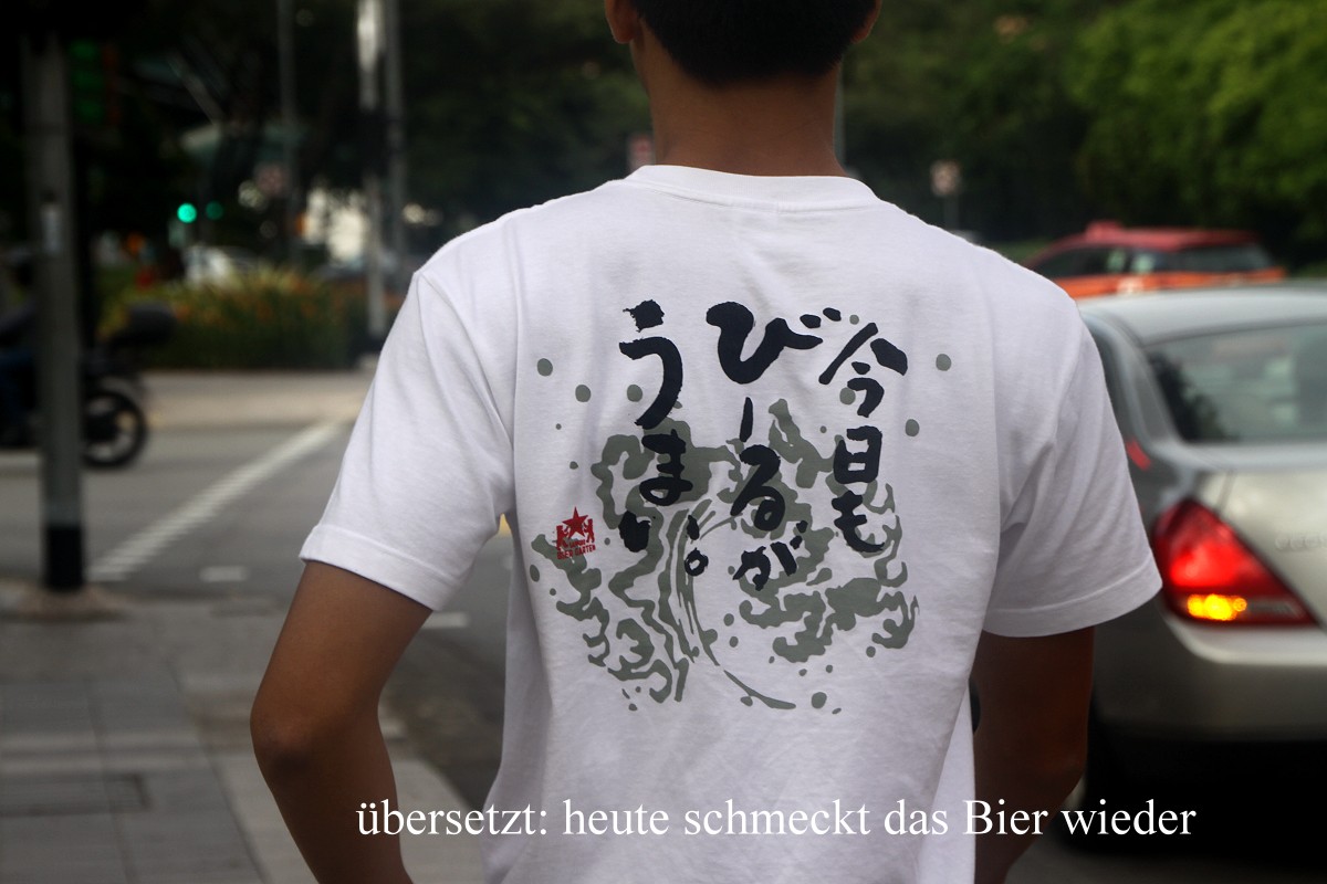 Gegen 17.15 h verließen wir das Museum und gingen zum Thai-Restaurant, in dem wir gestern schon so gut gegessen hatten. Auf dem Weg dorthin begegnete uns ein junger Mann mit einem T-Shirt, auf dem auf japanisch geschrieben stand: "Heute schmeckt das Bier wieder". Das gefiel besonders Entelchen... |