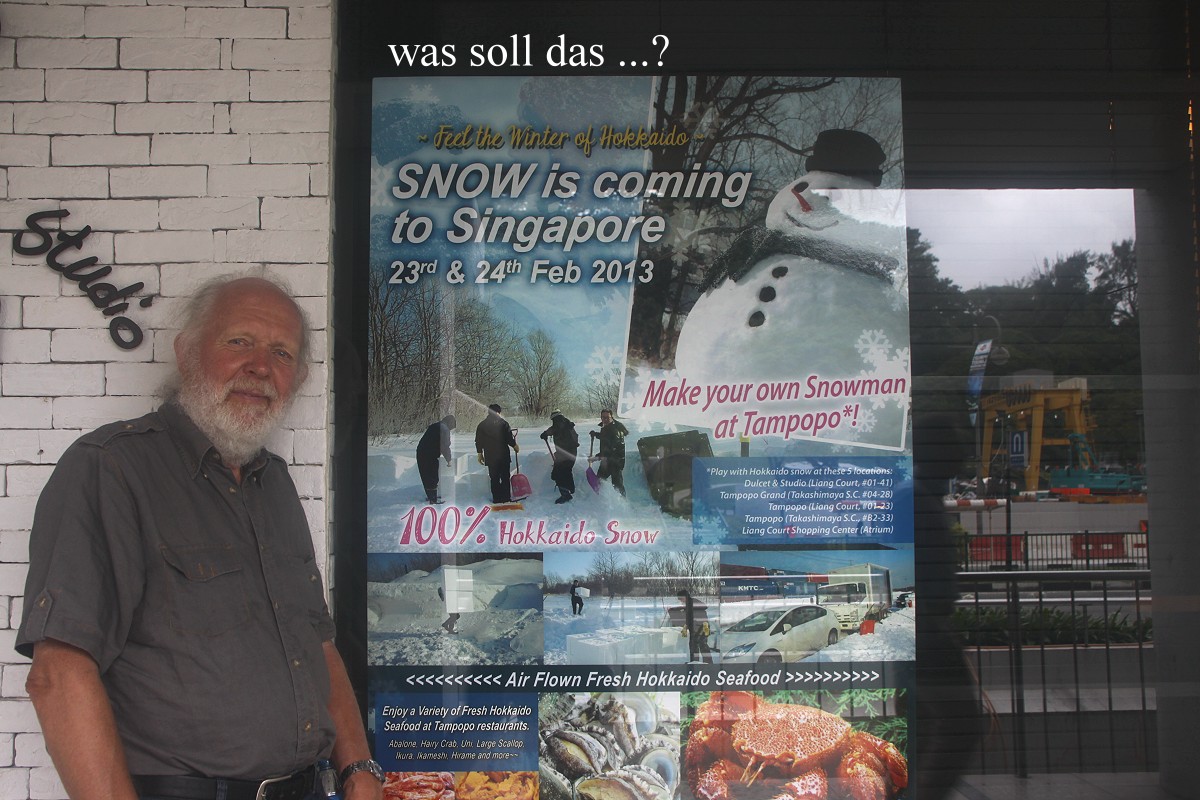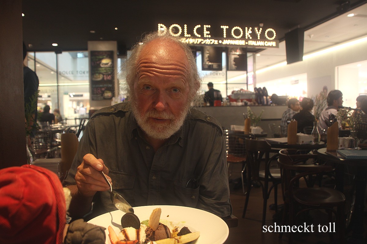 Insgesamt war die Strecke doch wesentlich länger, als die, die wir vorgestern auf dem Rückweg von der Orchard Road genommen hatten. Uns taten beide die Beine weh, als wir endlich am Ziel, dem japanischen Café, ankamen. Ich bestellte Banana Split in japanischer Fassung, sehr lecker. Tomoko wählte Rote Bohnen-Creme mit Mochi, diese klebrigen Bällchen, bei deren Genuss in Japan regelmäßig 5 bis 6 Leute pro Jahr ersticken. Tomoko überlebte Gott sei Dank, doch sie brauchte dringend etwas Wasser, da offensichtlich ein kleiner Rest im Hals steckengeblieben war …!?! |