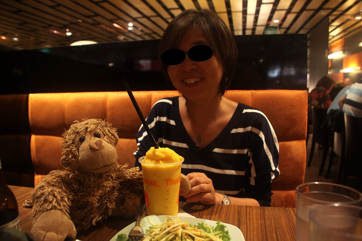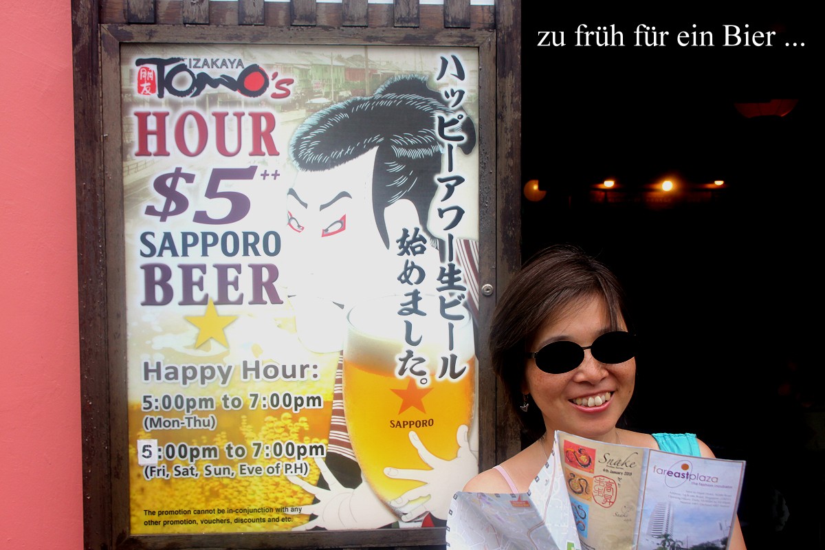 Ich las auf einer gemütlichen Liege die Tageszeitung. Tomoko ging früher ins Zimmer zurück und färbte sich dort ihre Haare kastanienbraun, sehr hübsch… Irgendwann wurde es mir am Pool zu heiß und ich ging auch ins Zimmer zurück. Da Tomoko nach einiger Zeit Appetit bekam, gingen wir auf meinen Vorschlag hin in die Essensetage der nahen Funan Digitalife Mall. Dort gibt es aber leider kaum vegetarische Kost. Tomoko stellte sich ein vegetarisches Süppchen zusammen, das ihr aber überhaupt nicht schmeckte. Mein chinesisches Reisgericht für 5,- SIN$ war einigermaßen akzeptabel. Etwas enttäuscht gingen wir aufs Zimmer zurück. Dort blieb Tomoko aber nicht lange sondern fuhr noch mal nach Somerset, wo sie wieder ein paar Sachen einkaufte, einen Hut und eine warme Wollhose. Das letztere war merkwürdig! Was macht man in Singapur mit einer Wollhose bei dem dortigen Klima? Egal, Tomoko war glücklich. Ich hatte inzwischen etwas im Internet gesurft und E-Mails geschrieben. Als Tomoko zurückkam, machte sie das Fernsehen an. Die Werbung versprach um 19.00 h eine Fortsetzung der schon gestern angeschauten chinesischen Fernsehserie, vergleichbar mit Serien wie "Sturm der Liebe, Folge 1023" im deutschen Fernsehen. Vorher gingen wir aber noch zum Abendessen. Den ursprünglichen Plan wieder im indischen Restaurant von gestern zu essen, änderten wir. Stattdessen suchten wir in "Raffles City" das thailändische Restaurant auf, in dem wir vor 5 Wochen schon mal sehr gut gegessen hatten. Auch diesmal war das Essen toll. Tomoko trank dazu mit Äffchen einen leckeren Mango-Shake, ich mit Entelchen ein Singha Bier. |
