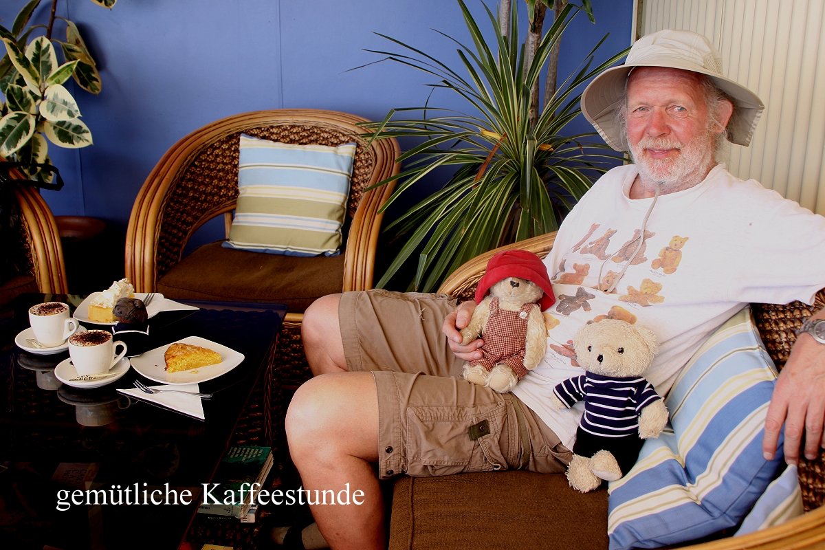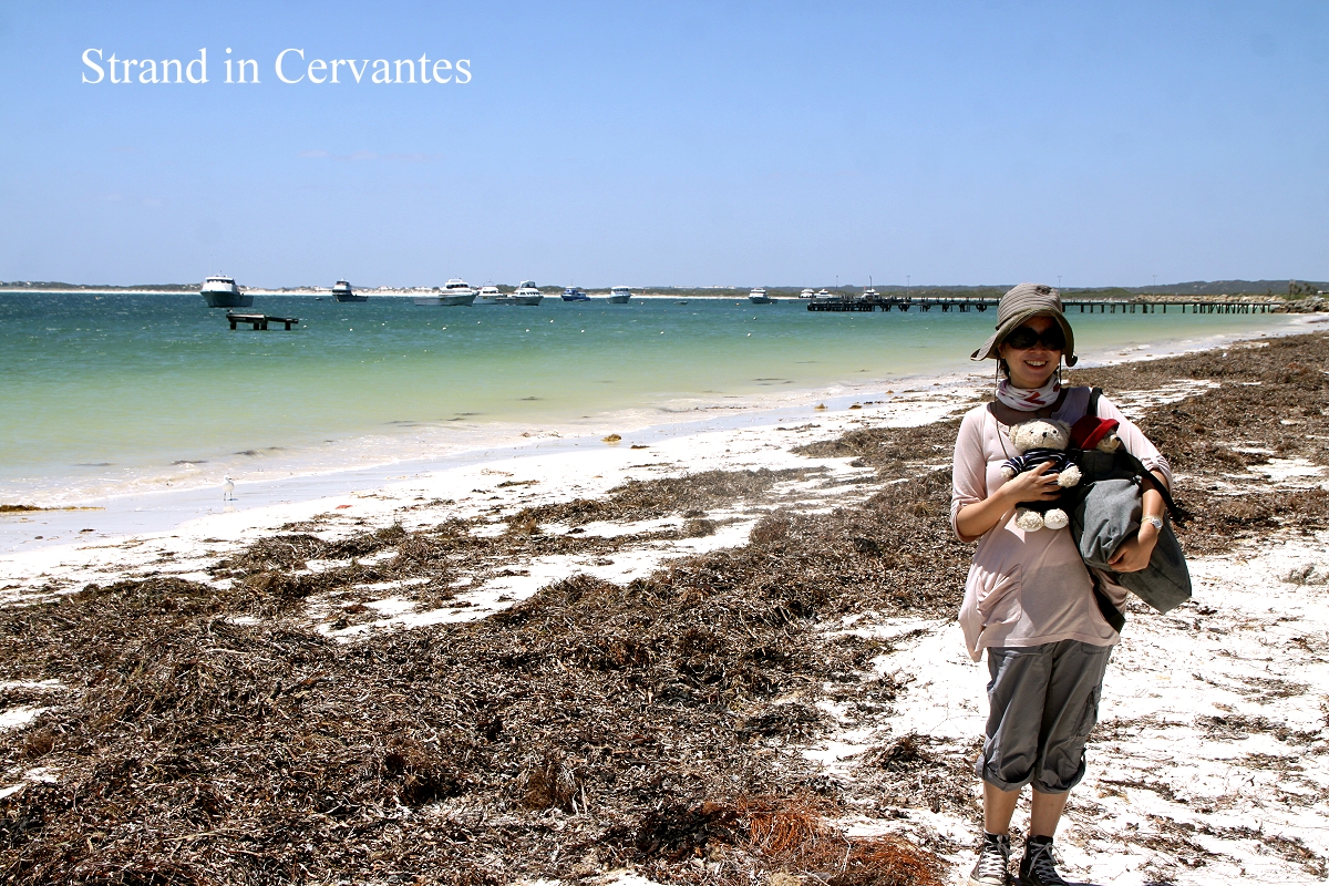 Am Ende des Rundwegs parkten wir das Auto in der Nähe des Info-Centers. Ich kaufte mir dort einen Autoatlas von Westaustralien, in dem auch die unbefestigten Straßen im Outback alle eingezeichnet sind. Diesen werden wir sicher in den nächsten Tagen noch brauchen. Um 12.50 h brachen wir auf und fuhren 17 km nach Cervantes, einem kleinen Ort am Ozean. Auf der Suche nach einem Café wurden wir am Caravan Park direkt am Strand fündig. Es gab leckeren Kuchen und Cappuccino. |