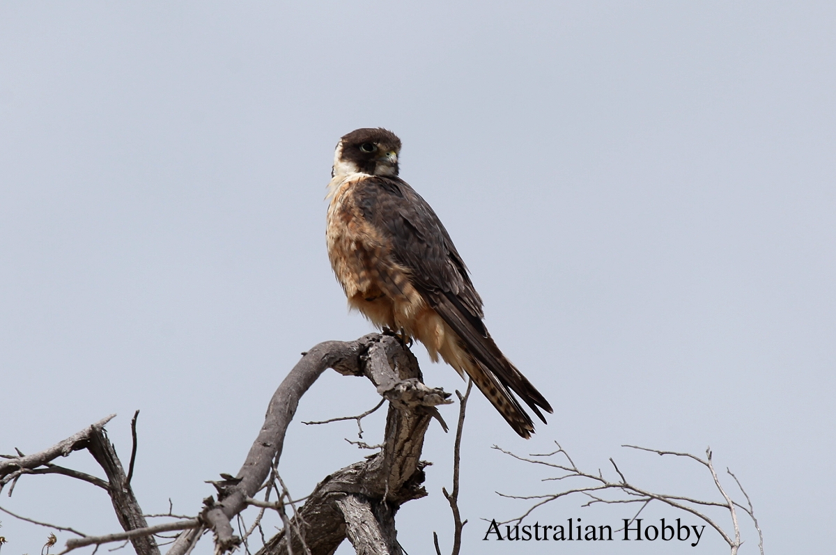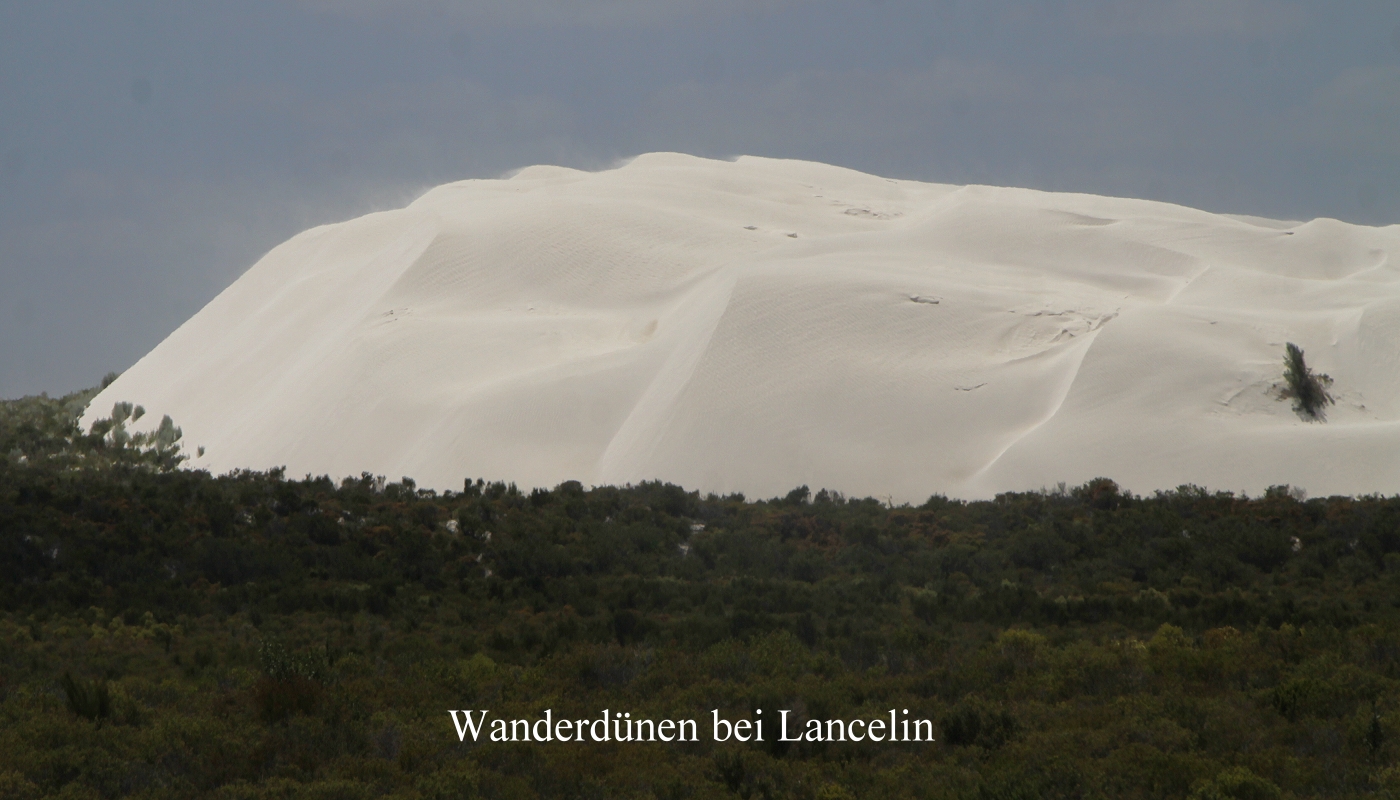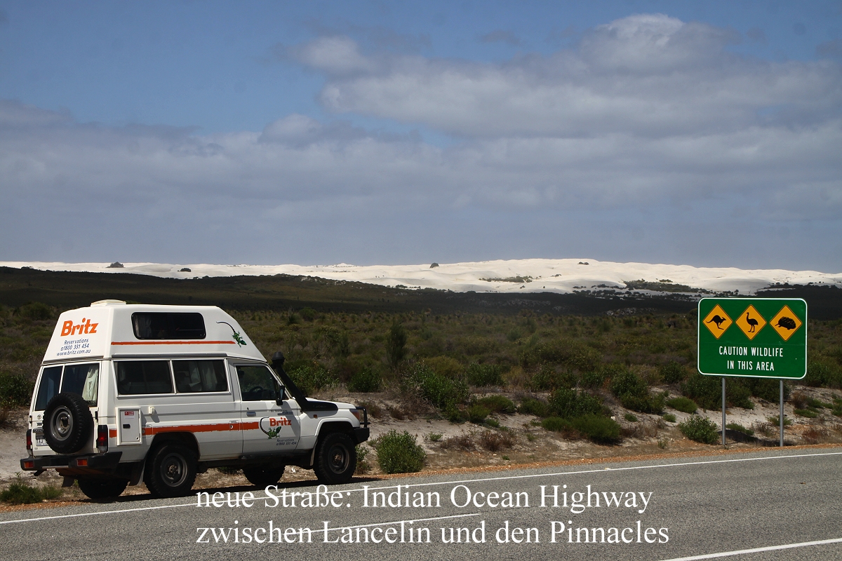 Gegen 7.00 h wurden wir wach. Das Wetter hatte sich deutlich gebessert. Es wehte zwar ein starker Wind, der zwischenzeitlich die Richtung gewechselt hatte, nicht mehr westlich vom Indischen Ozean, sondern mehr von Südosten, doch die Wolkendecke hatte schon große Lücken. Zum Frühstück gab es wie immer Cornflakes und Toast. Gegen 9.00 h waren wir abfahrbereit. Tomoko kaufte noch schnell in der nahen Bäckerei etwas Kuchen, dann tankten wir noch voll und fuhren los auf der neugebauten Straße "Indian Ocean Hwy" Richtung Norden. Wir fuhren durch eine hügelige einsame Landschaft, bewachsen mit vielen kleinen stacheligen grünen Büschen. Immer wieder tauchten in der Nähe der Straße gewaltige schneeweiße Sanddünen auf. Hinweisschilder am Straßenrand wiesen daraufhin, dass in diesem Gebiet Wildtiere wie Kängurus, Emus und Echidnas beheimatet sind, doch außer ein paar leider überfahrenen Kängurus bekamen wir wenig Tiere zu sehen. Bei einem kurzen Fotostopp entdeckten wir 3 kleine Vögelchen (Australian Pipit) im Straßengraben. Einmal stoppten wir kurz, als unmittelbar am Straßenrand ein Falke (Hobby) auf einem Strauch sitzend auftauchte. |