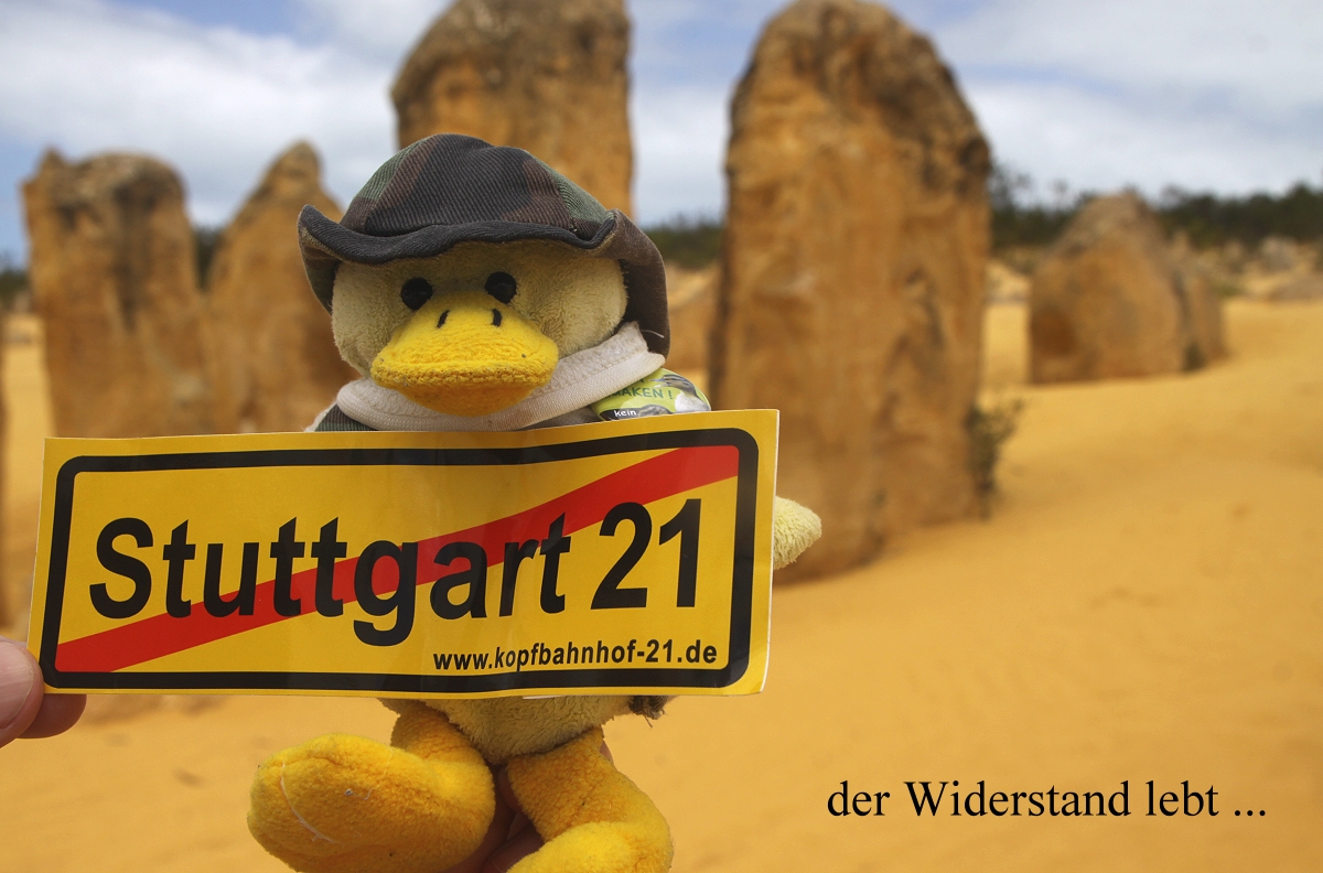 Des öfteren machten wir halt und fotografierten fleißig. An einer Stelle konnten wir mehrere Black-faced Woodswallows beobachten, die immer wieder im Sand nach Futter suchten und sich dann wieder auf die Spitze eines der Obelisken setzten. Der Wind war immer noch sehr, sehr heftig. Wenn wir Entelchen auf einem Stein fotografierten, mussten wir höllisch aufpassen, dass er nicht davon gepustet wurde. |