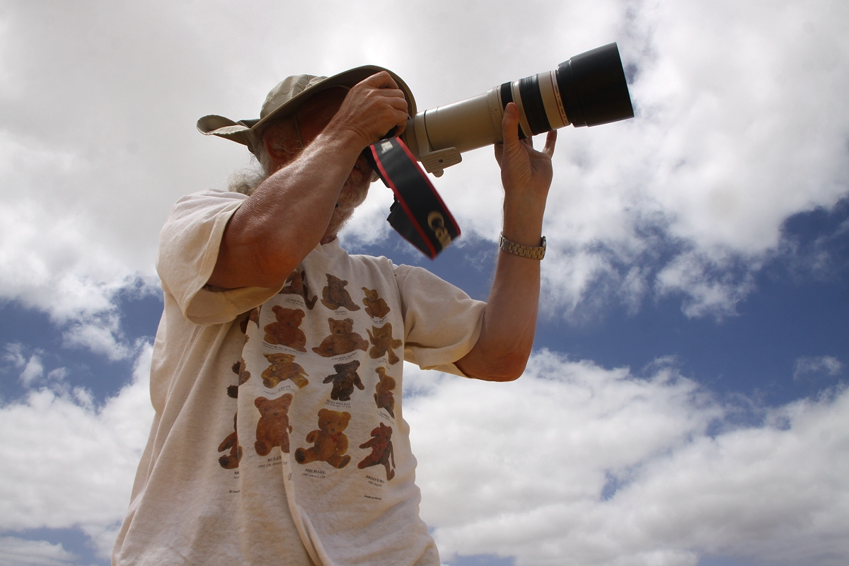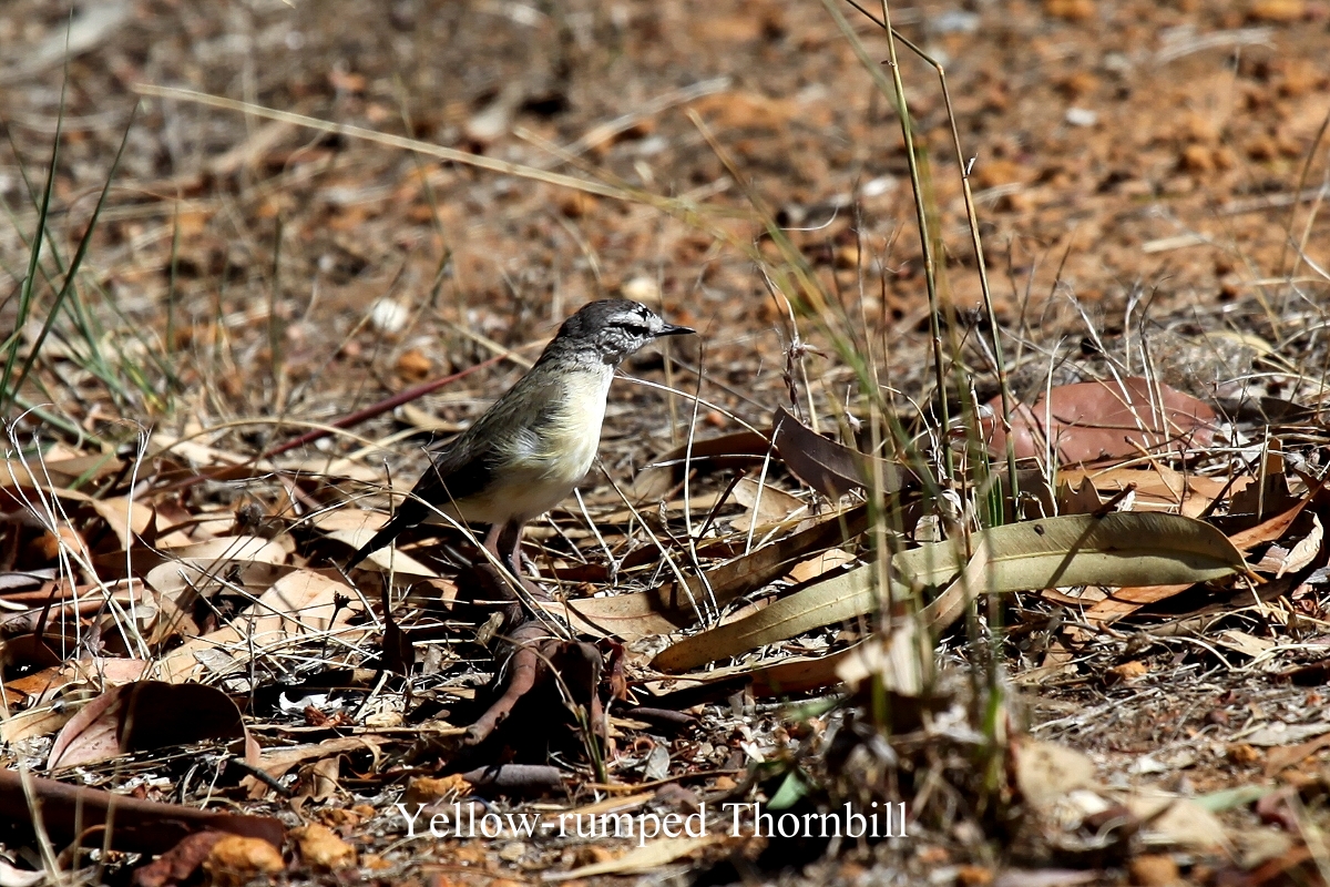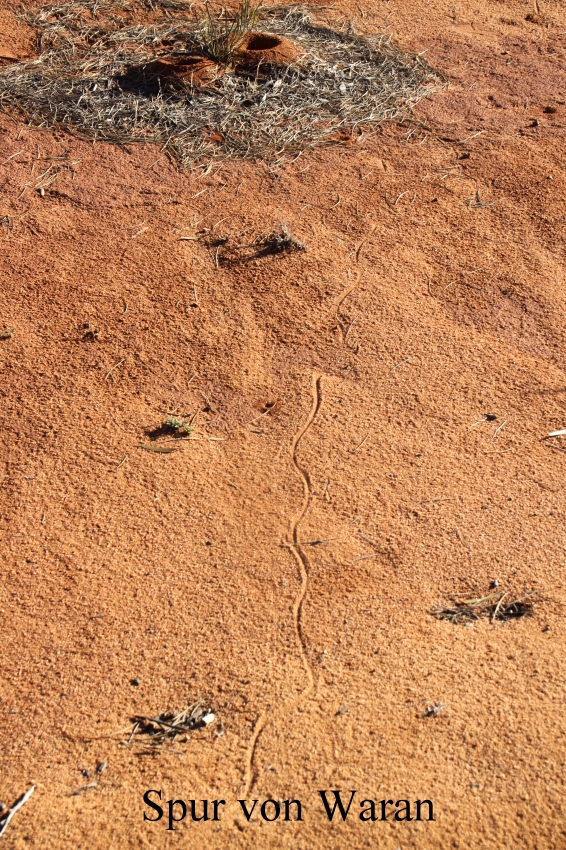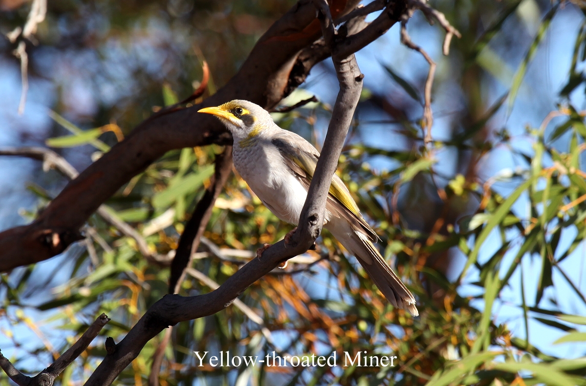 Tomoko machte sich ein Sandwich dazu, da sie natürlich mächtig Hunger hatte. So ruhten wir uns ein wenig aus. Es war inzwischen wieder über 30°. Trotzdem wollten wir noch eine kleine Erkundungsfahrt zu einer der Stellen machen, die uns empfohlen worden waren. Also machten wir uns gegen 16.15 h noch mal auf und fuhren ca. 10 km die Sandstone Road nach Osten. Hier war kein Mensch mehr zu sehen, leider auch sehr wenige Vögel. Erst auf dem Rückweg gegen 18.00 h gab es mehr zu sehen. Zwei Bienenfresser starteten immer wieder von einem Zweig in die Luft und jagten Insekten. Tomoko wagte sich ein wenig in die Büsche. Dort sah sie 2 Mulga Parrots und fotografierte sowohl einen jungen wie auch einen erwachsenen Red-capped Robin. Ich untersuchte inzwischen den feinen roten Sand nach Spuren. Etliche geschlängelte Rillen wiesen auf Schlangen und Echsen hin, die wohl am Abend ihr Versteck verlassen um sich auf dem roten Sand der Straße zu wärmen. Tomoko kam bald zurück. Auch sie fürchtete in dem Gelände auf Schlangen zu stoßen. Gemeinsam sahen wir dann noch einen farbenprächtigen Yellow-throated Miner. |