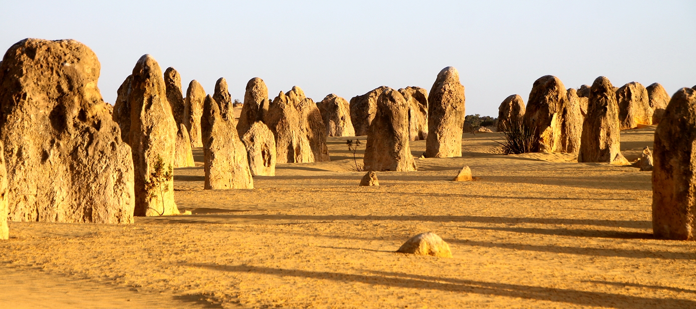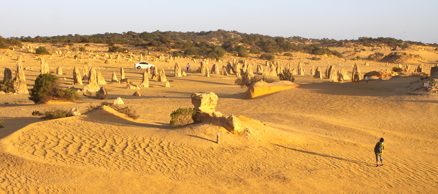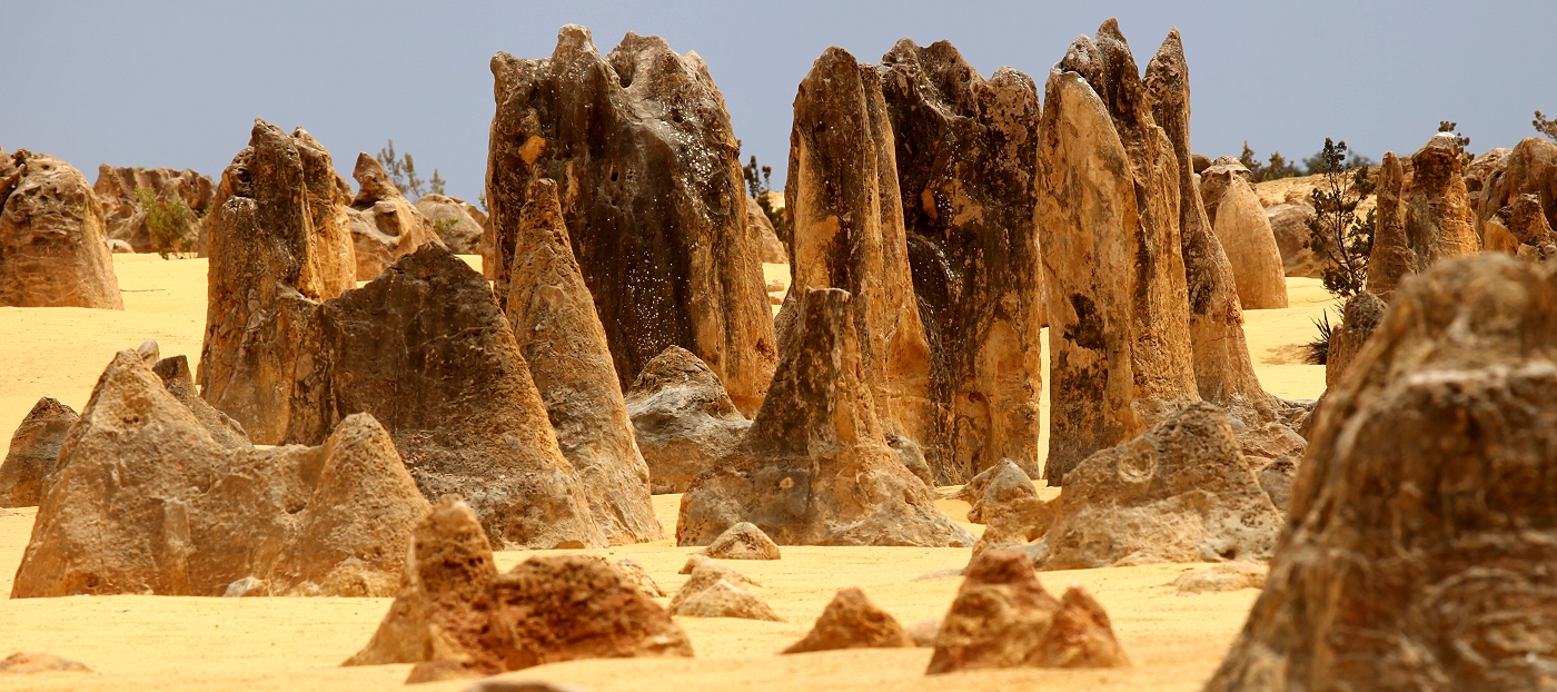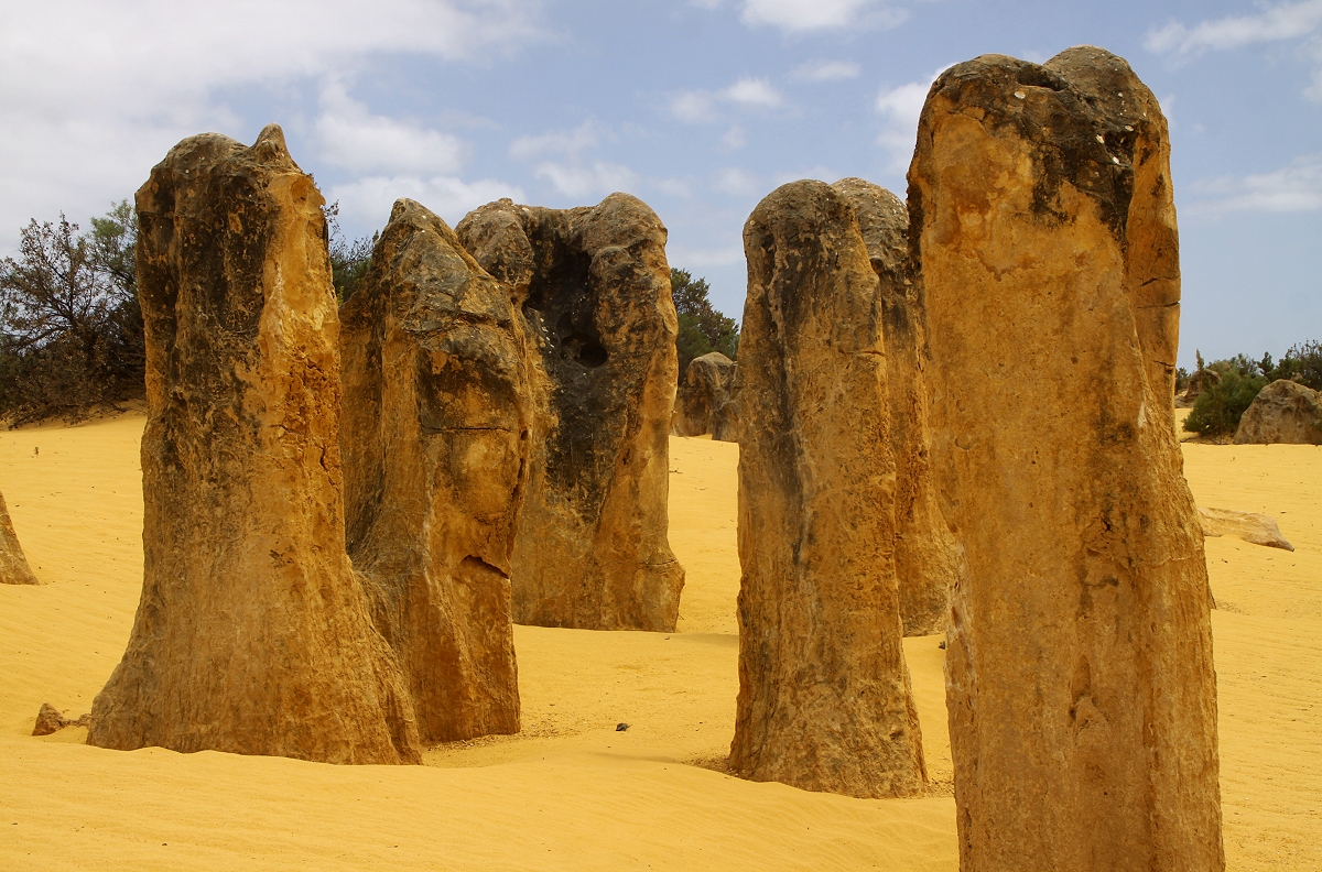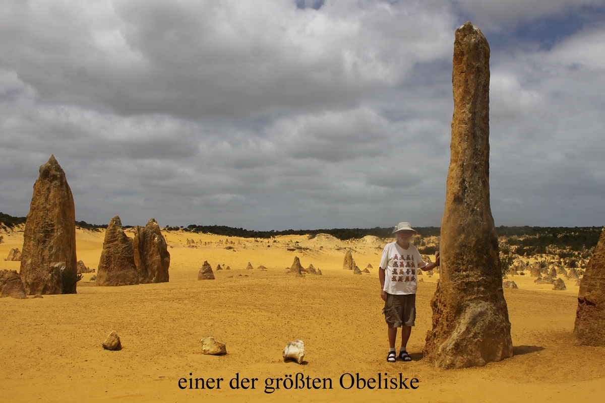 Nach 75 km erreichten wir gegen 11.00 h die Pinnacles. Dies ist ein sandiges wüstenähnliches Gebiet mit zahlreichen Steinen, die wie Obeliske bis zu 3 ½ hoch in dichten Gruppen zusammenstehen. Eine 6 km lange Sandpiste führt durch diese wirklich eigentümliche Landschaft. |