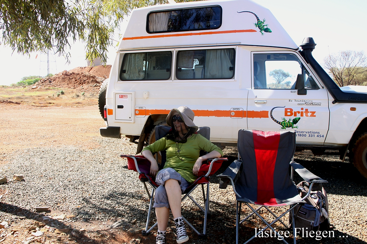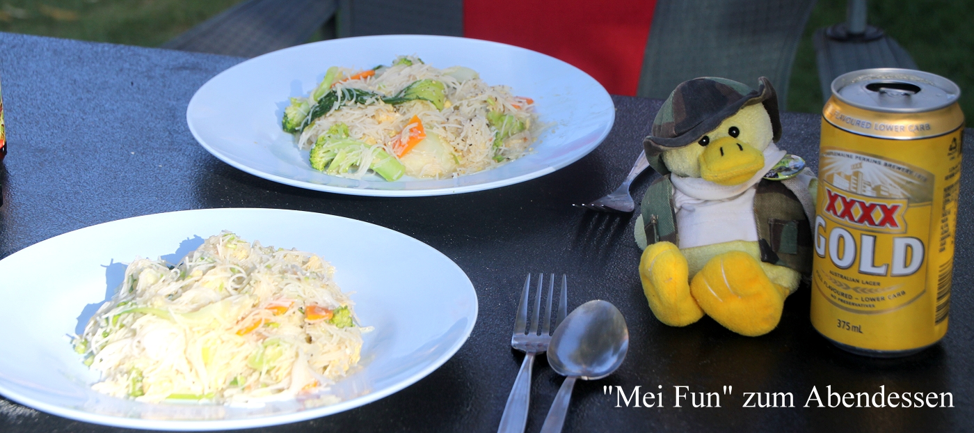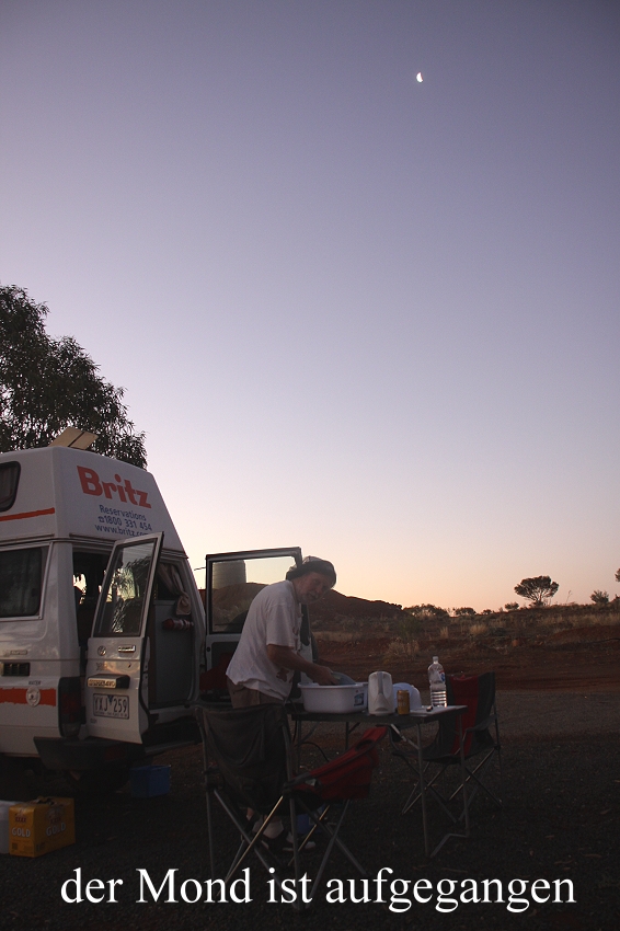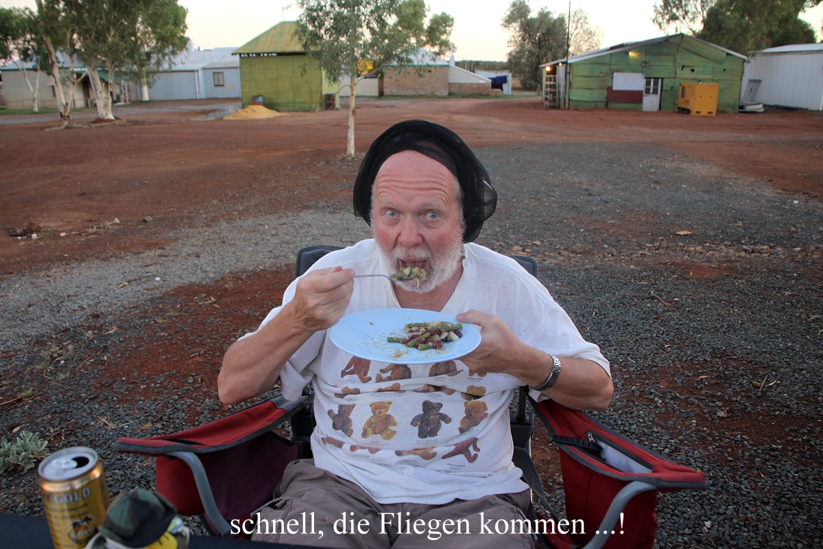Die Sonne sank langsam tiefer und die Schatten wurden immer länger. Wir fuhren wieder zum Caravan-Park zurück. Tomoko begann gleich mit den Vorbereitungen zum Abendessen. Ich fing derweil schon mal an Tagebuch zu schreiben. Zum Abendessen gab es einen Kartoffel-Bohnen-Salat mit Knoblauch-Toast. Dazu trank ich mit Entelchen noch ein Bier. Das Essen gestaltete sich wegen der Fliegen etwas schwierig. Ich lüftete mein Moskitonetz, schob eine volle Gabel in meinen Mund und zog schnell das Netz wieder herunter. Das klappte ganz gut. Tomoko wurde erstaunlicherweise nicht attackiert. |