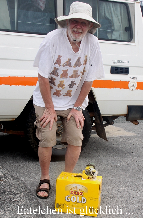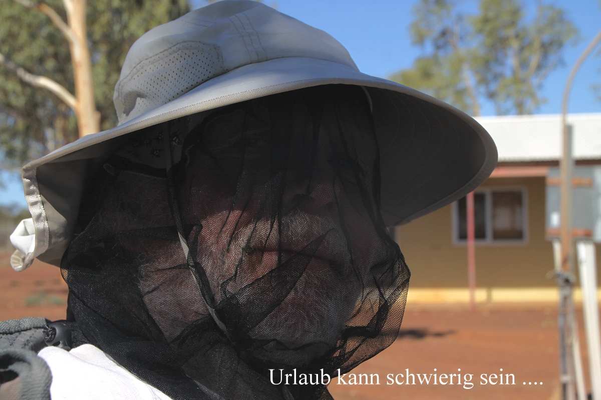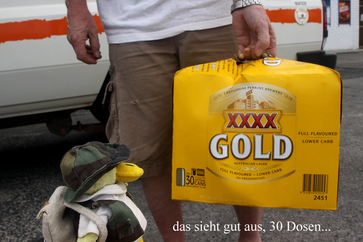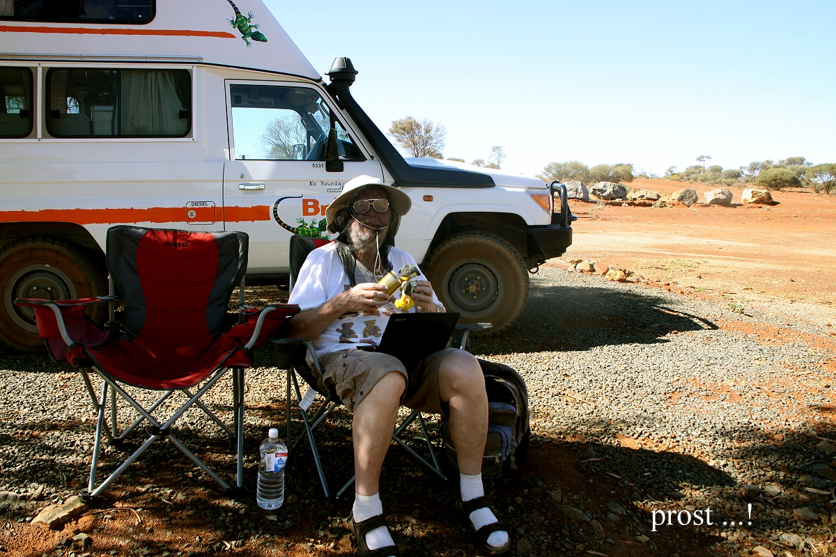 Die Sonne sank langsam tiefer und die Schatten wurden immer länger. Wir fuhren wieder zum Caravan-Park zurück. Tomoko begann gleich mit den Vorbereitungen zum Abendessen. Ich fing derweil schon mal an Tagebuch zu schreiben. Zum Abendessen gab es einen Kartoffel-Bohnen-Salat mit Knoblauch-Toast. Dazu trank ich mit Entelchen noch ein Bier. Das Essen gestaltete sich wegen der Fliegen etwas schwierig. Ich lüftete mein Moskitonetz, schob eine volle Gabel in meinen Mund und zog schnell das Netz wieder herunter. Das klappte ganz gut. Tomoko wurde erstaunlicherweise nicht attackiert. |