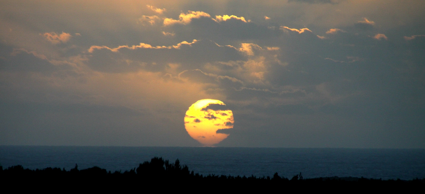 Als wir den Park verließen, konnten wir von einer kleinen Anhöhe sehen, wie die Sonne als großer leuchtender Ball im Meer versank, ein wirklich erhabener Anblick. Es war genau 19.27 h als der letzte kleine Lichtschimmer verschwand. |