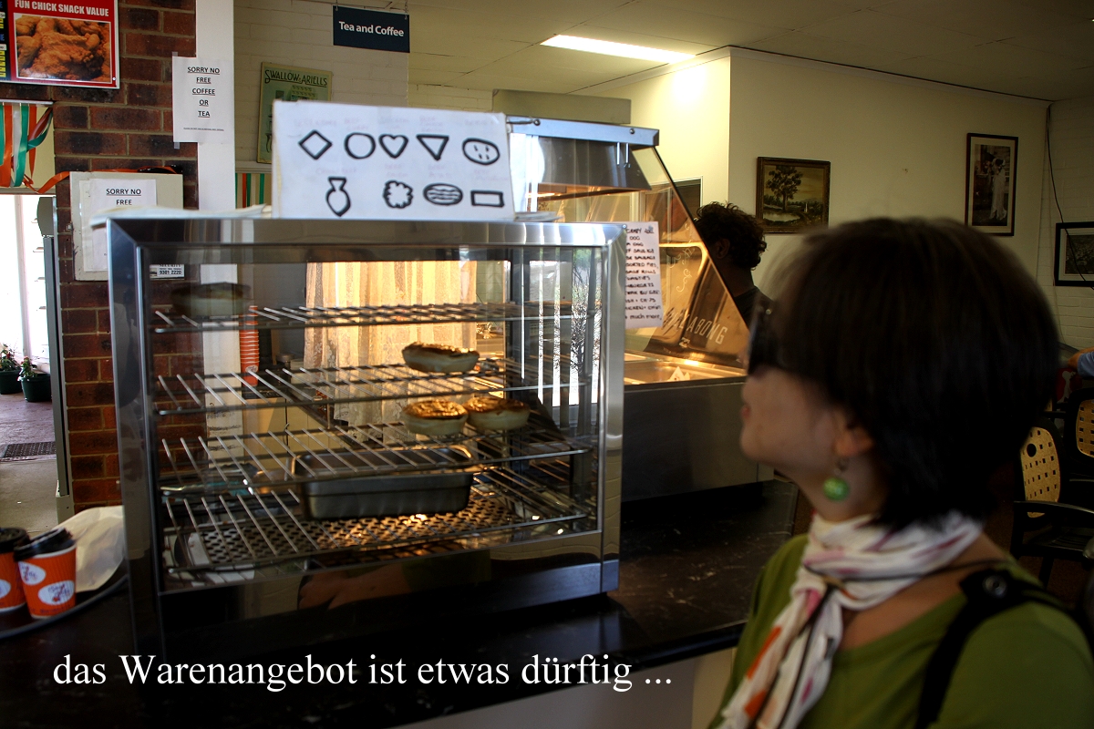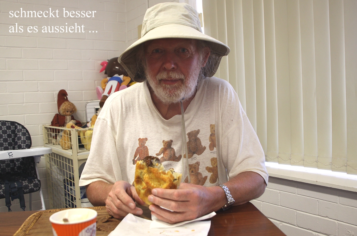 Es wurde immer wärmer. Als wir mal wieder anhielten und die Türen öffneten, wurden wir gleich von einem Schwarm kleiner Fliegen überfallen. Die sind mehr als lästig, weil sie immer zielbewusst Augen, Nase und Mundwinkel ansteuern und sich kaum vertreiben lassen. Gott sei Dank hatte Tomoko mir im Yanchep NP auch ein Moskitonetz für den Kopf gekauft. Wir umhüllten beide mit diesen Netzen unsere Köpfe und hatten so endlich Ruhe vor den Plagegeistern. Um 12.30 h erreichten wir Wubin. Hier trafen wir auf den Northern Highway, der Perth mit dem nördlichen Teil von Westaustralien verbindet. In einem winzigen Supermarkt kauften wir ein paar Kleinigkeiten ein und begaben uns dann in ein kleines Restaurant, das an eine Tankstelle angeschlossen war. Der Begriff Restaurant war allerdings maßlos übertrieben. An der Theke herrschte Chaos. Eine Aborigines-Großfamilie kaufte sich ihr Mittagessen zusammen, was furchtbar lange dauerte. Als wir endlich dran waren, kauften wir uns 2 Kaffee im Pappbecher und für mich noch einen Pie mit einer undefinierbaren braunen Paste drin, bestehend aus Bohnen und Hackfleisch. Wider Erwarten schmeckte es aber ganz gut. Leider gab es überhaupt nichts Vegetarisches, so dass Tomoko hungern musste, die arme... |