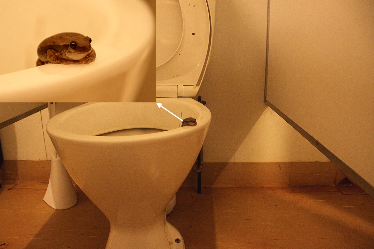 Inzwischen war die Sonne untergegangen und der Himmel färbte sich dunkel orange im Westen und die ersten Sterne begannen zu funkeln. Die zunehmende Mondsichel war schon seit längerem zu sehen. Jetzt fehlte noch eine erfrischende Dusche. Bei den Waschräumen war das Licht abgestellt. Glücklicherweise konnte ich noch jemand auftreiben, der bei dem laut laufenden Dieselgenerator den entsprechenden Hauptschalter betätigte. Die Herrendusche war im Umbau, dafür war die Damendusche frei für jedermann. Also duschten wir einfach gemeinsam. Als ich vor dem Verlassen des Duschraums noch mal kurz die Toilette benutzen wollte und den Deckel hob, schaute mir ein kleiner Frosch entgegen. |