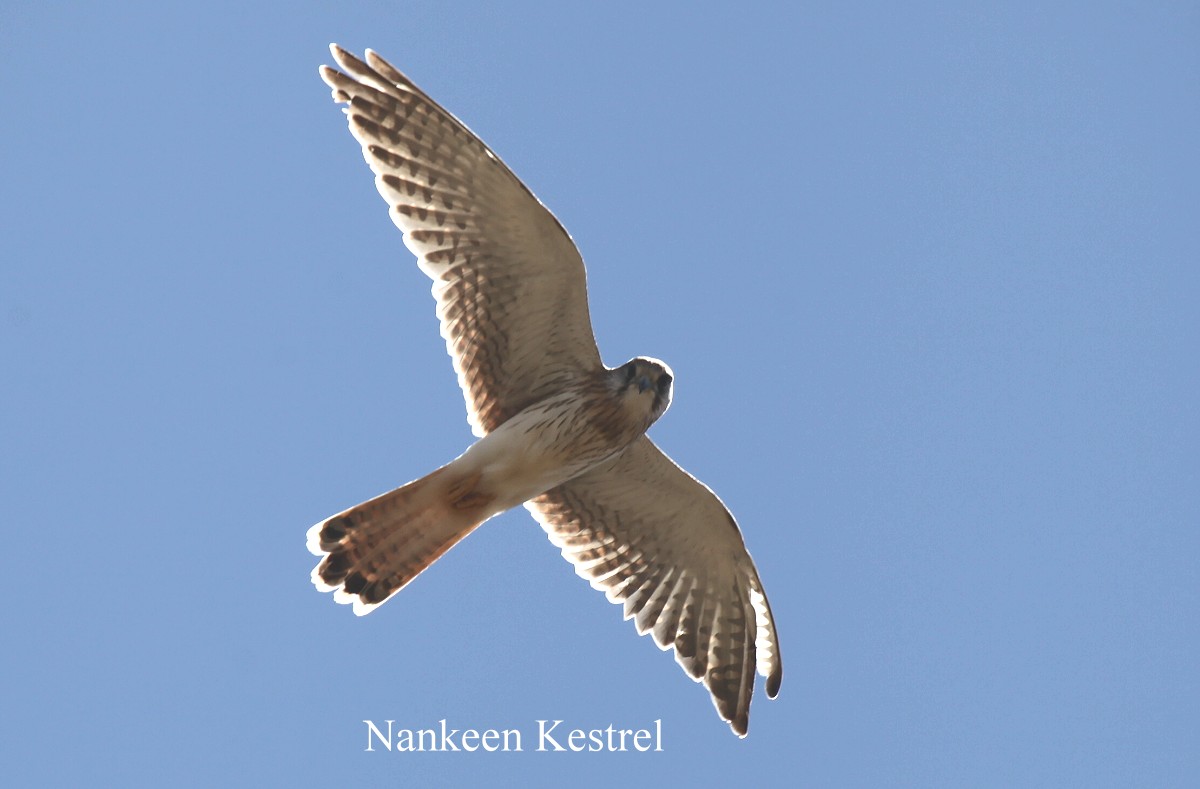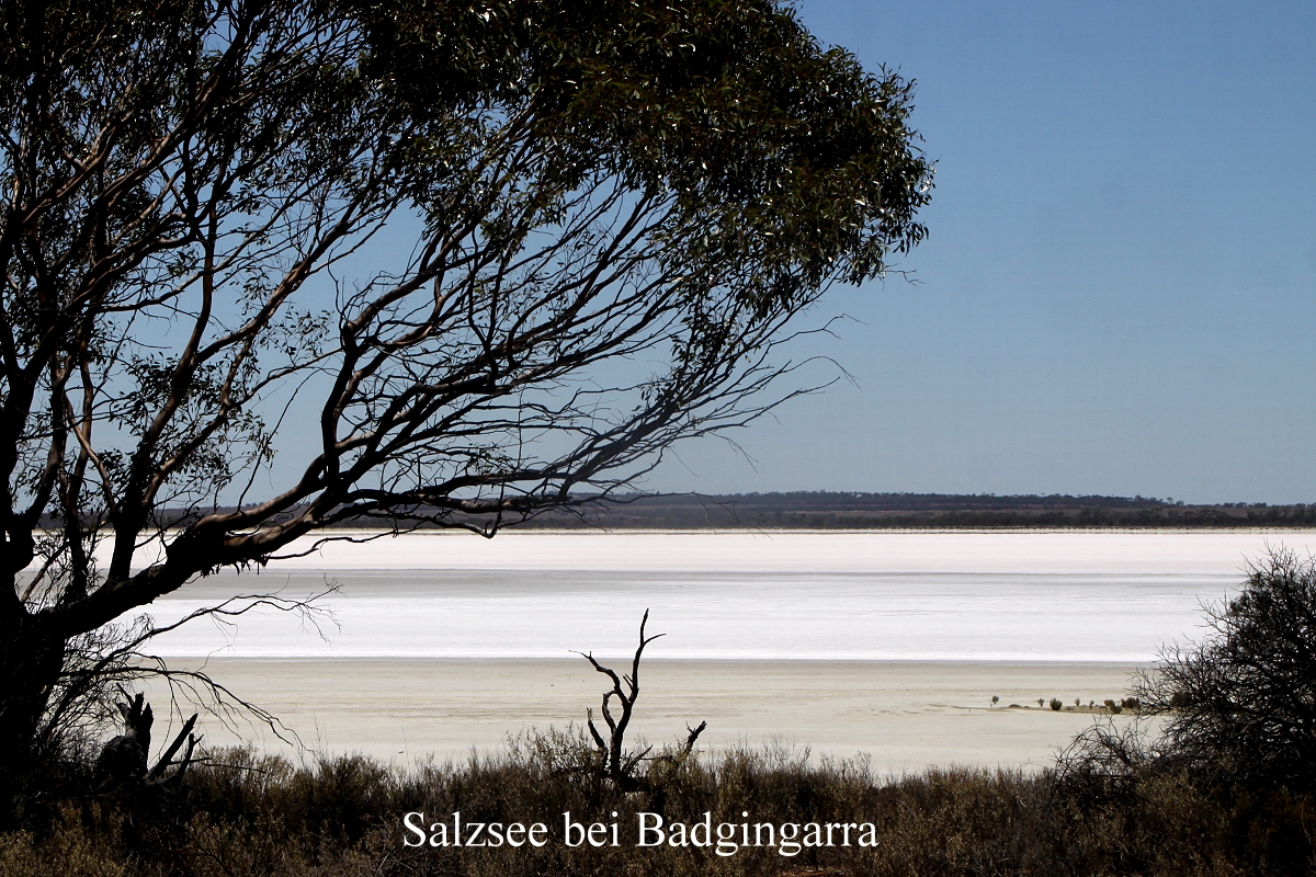 Wir fuhren weiter. Wieder führte die Strecke über kleine Nebenstraßen nach Osten. Wir passierten etliche kleine Salzseen, deren in der Sonne gleißendes Weiß unsere Augen blendeten. An einer Stelle machten wir halt. 3 junge Falken (Nankeen Kestrel) jagten durch die Lüfte, wobei sie sich immer wieder gegen den starken Wind wandten und förmlich in der Luft stehen blieben. Wir bekamen Lust mitzufliegen… |