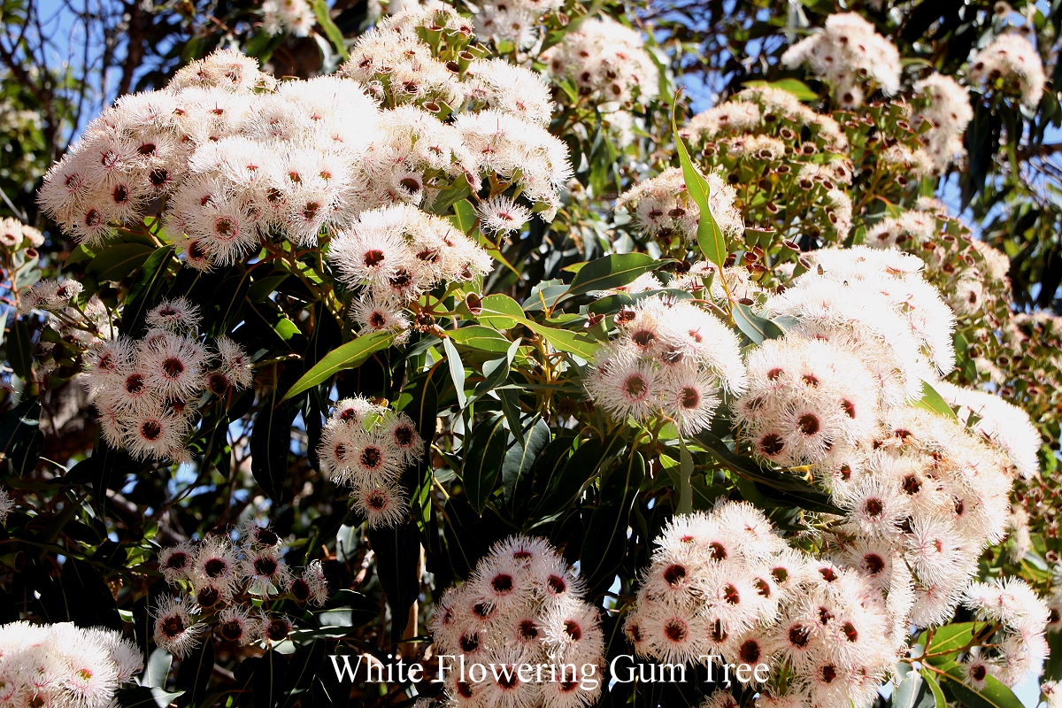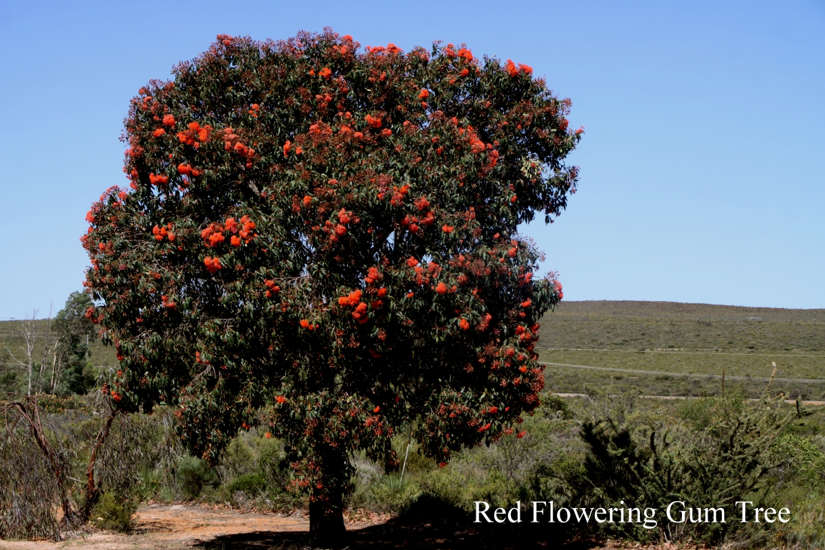 Wir fuhren weiter in den Ort Badgingarra, ein einsames Nest, bestehend aus einer Tankstelle, einer Taverne und ein paar Häusern. Die Temperatur war inzwischen auf 24° angestiegen. Der lebhafte Wind war wieder aufgefrischt. Wir suchten einen kleinen Supermarkt, doch den gab es nicht. Stattdessen sahen wir auf einem Parkplatz viele Vögel, Willy Wagtail, Rufous Whistler, Magpie mit Jungem, Thornbill, Brown Honeyeater und New Holland Honeyeater. Ich machte ein paar Fotos von einigen Eukalyptus-Bäumen (Gum Trees), die in voller Blüte standen. |