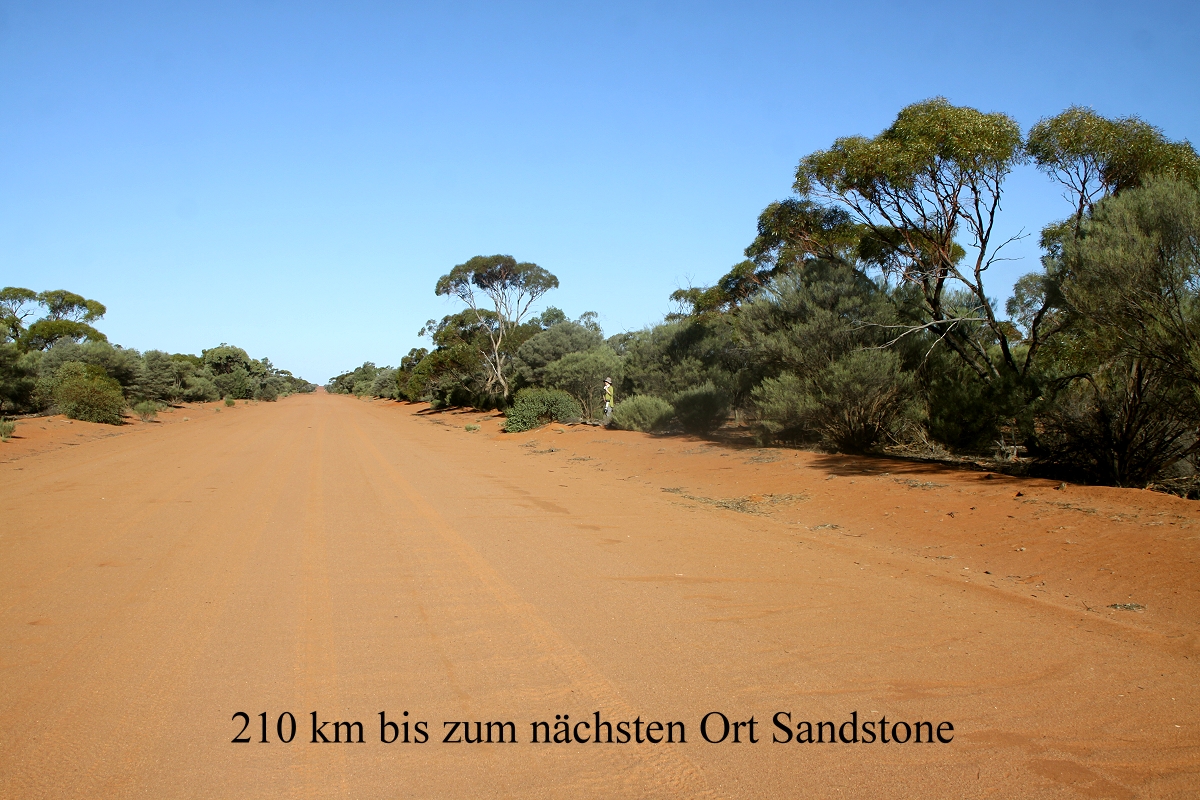 Tomoko wurde um 6.00 h wach, ich erst um 7.00 h. Es war deutlich kühler geworden, nur 16° im Auto. Die Sonne schien aber schon und strahlte vom wolkenlosen Himmel, so dass es nicht lange kühl blieb. Ich duschte noch mal und anschließend frühstückten wir. Um 8.00 h waren wir schon startbereit. Die Rezeption war noch geschlossen, aber kurze Zeit später wurde geöffnet. Wir gaben den Schlüssel zu den Waschräumen ab, erhielten die Kaution von 10,- $ zurück und fuhren los. Unser heutiges Ziel war Paynes Find, ein Ort, den ein australischer Vogelkundler empfohlen hatte. Der liegt allerdings ca. 350 km entfernt in nordöstlicher Richtung im Landesinneren. Es ging über menschenleere Straßen, zum großen Teil unbefestigt und staubig. |