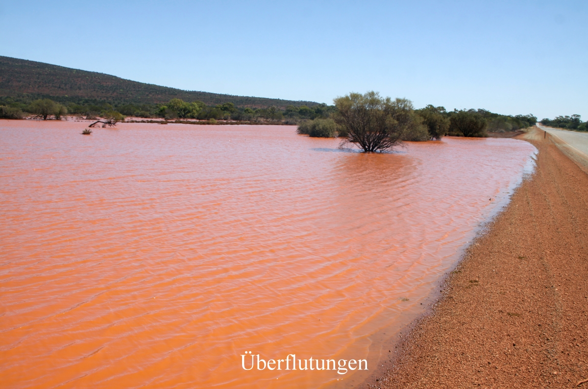 Der Preis war mit 15,- $ allerdings etwas happig. Um 13.15 h fuhren wir weiter. Auf dem großen Highway war mehr Verkehr, besonders die großen bis zu 35 m langen Lastwagen (Road-Trains) kamen uns ziemlich häufig entgegen. Einmal mussten wir selbst ein solches Ungetüm überholen, was wirklich ungewöhnlich lange dauert. Ungefähr 40 km vor Paynes Find waren plötzlich rechts und links der Straße große rotbraune Wasserflächen zu sehen. Hier hatte es wohl vorgestern beim Wetterumschwung starke Regenfälle gegeben. Glücklicherweise war die Fahrbahn aber frei. |
