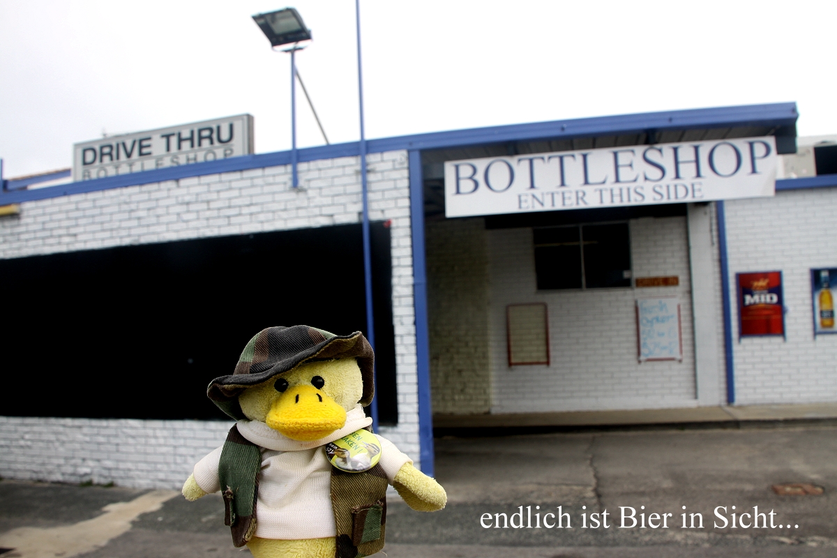 Gegen 5.30 h wurde ich wach. Ein Blick aus dem Fenster verhieß nichts Gutes. Dichte Wolken am Himmel, ein kräftig wehender Wind und ein feiner Sprühregen ließen mich noch nicht ans Aufstehen denken. Ich schlief noch mal ein. Gegen 7.00 h stand ich dann auf. Da Tomoko noch schlief, setzte ich mich nach draußen und las den Rest der schon aus Deutschland mitgebrachten Süddeutschen Zeitung. Inzwischen war die Wolkendecke aufgelockert und die Sonne lugte teilweise schon hervor. Die Temperatur war aber deutlich angenehmer als gestern, so um die 25°. Gegen 8.00 h wurde Tomoko wach. Nun hieß es Frühstück machen. Wieder gab es für mich Toast mit Käse und Honig, während Tomoko erneut Cornflakes aß. Dann packten wir alles zusammen, fuhren zur Rezeption und gaben unseren Toilettenschlüssel ab, so dass wir die hinterlegte Kaution von 20 $ zurückbekamen. Tomoko ergänzte unsere Kuchenvorräte in einer gegenüberliegenden Bäckerei. Dann suchten wir noch nach einem Liquor Store, um endlich das Entelchen versprochene Bier zu kaufen. |