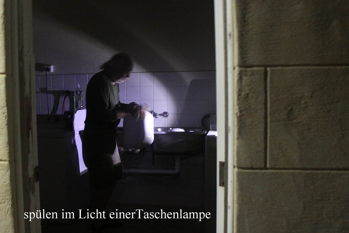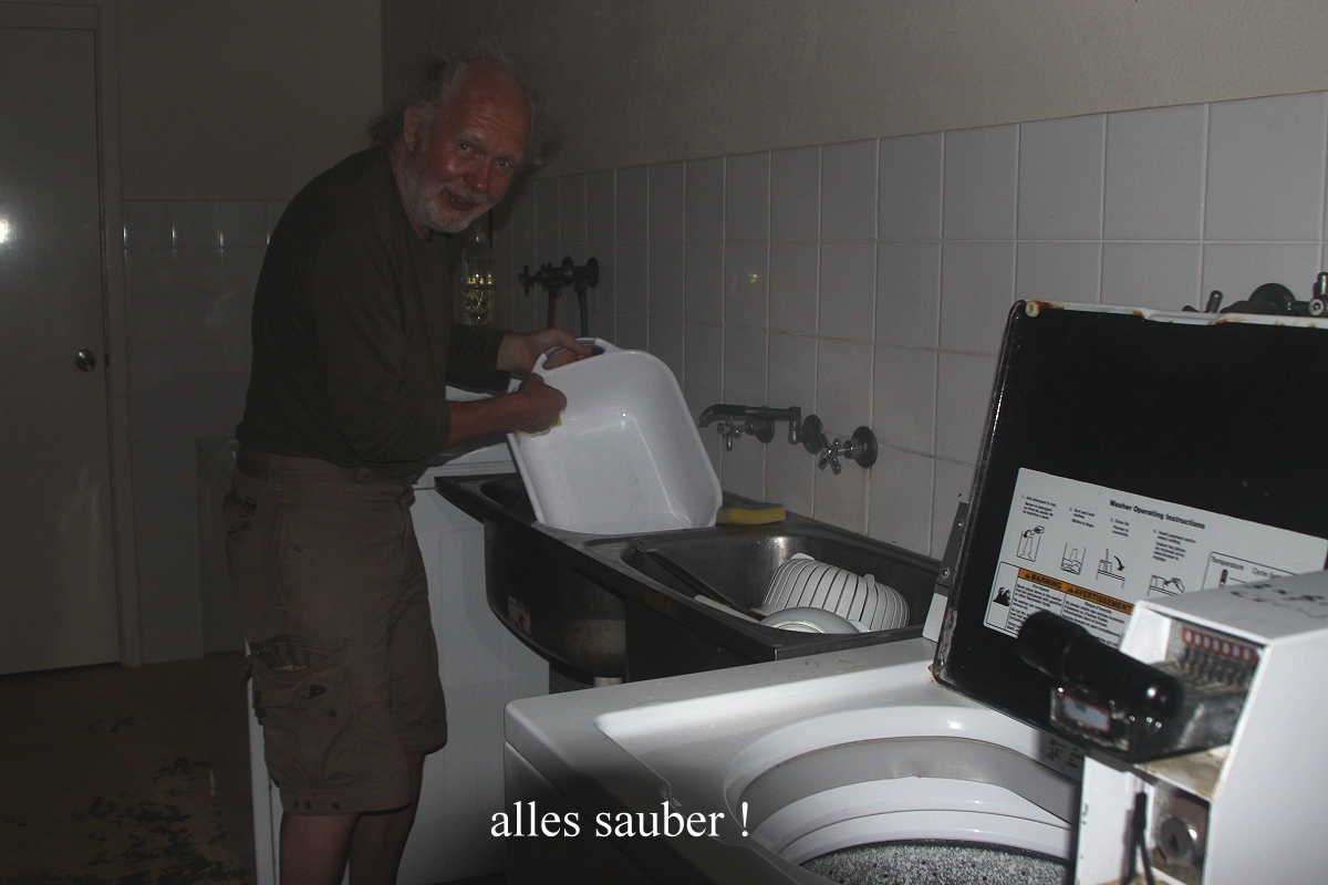 Beim Essen plötzlich ein Schreck, auf dem Zeltdach hatte sich etwas Regenwasser angesammelt, das durch einen heftigen Windstoß plötzlich über den Rand schwappte, genau auf meinen Rücken, brrrrr….Ich musste schnell das T-Shirt wechseln, der Wind war unangenehm kalt. Meine Aufgabe bestand wie immer darin das schmutzige Geschirr zu spülen, was ich auch jetzt tat. Da das Licht ja in der Laundry nicht funktionierte, nahm ich eine Taschenlampe mit, die die Arbeit einigermaßen erleichterte. |
