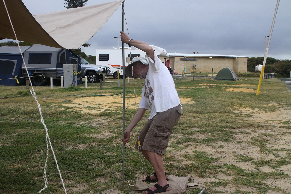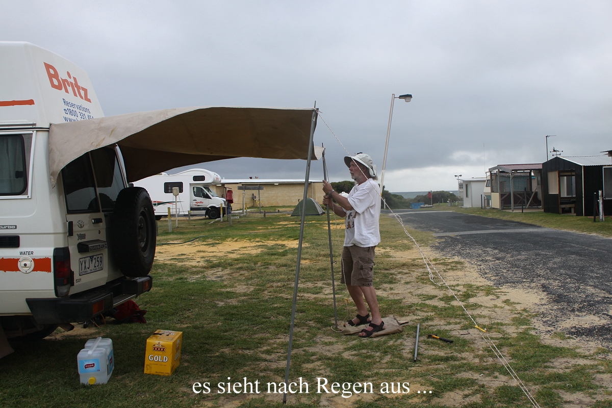 Tomoko kaufte noch ein paar Sachen bei Woolworth, dann ging es gegen 16.30 h wieder zurück die 120 km nach Lancelin, das wir um 17.40 h erreichten. Es hatte auf der Fahrt immer mal wieder ein wenig geregnet und auch in Lancelin war der Himmel stark bewölkt. Im Caravan-Park bekamen wir den gleichen Platz wie gestern zugewiesen. Schnell befestigte ich die Zeltplane am Auto, diesmal hinten um die Kochstelle trocken zu halten, denn es drohte immer wieder leicht zu nieseln. |
