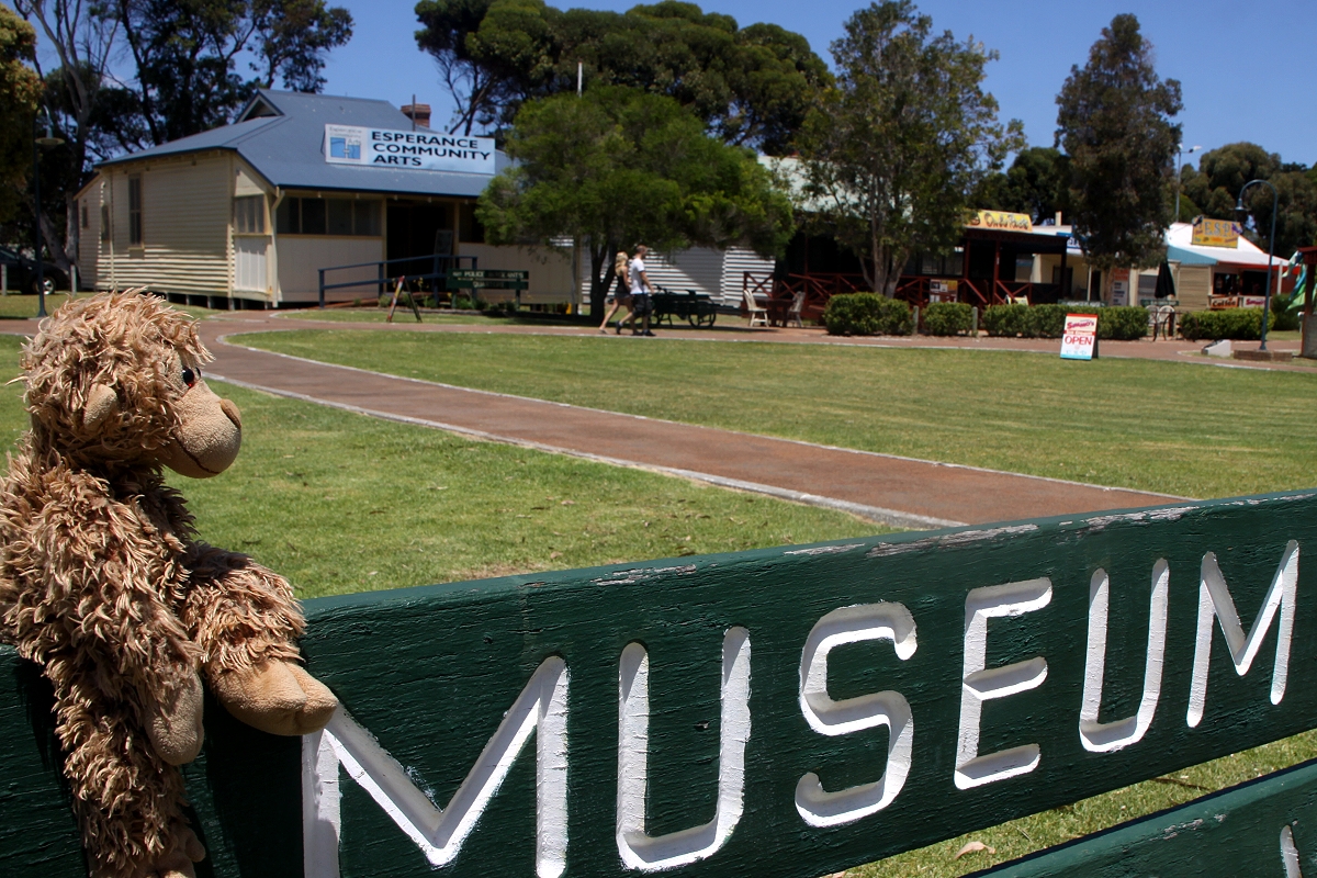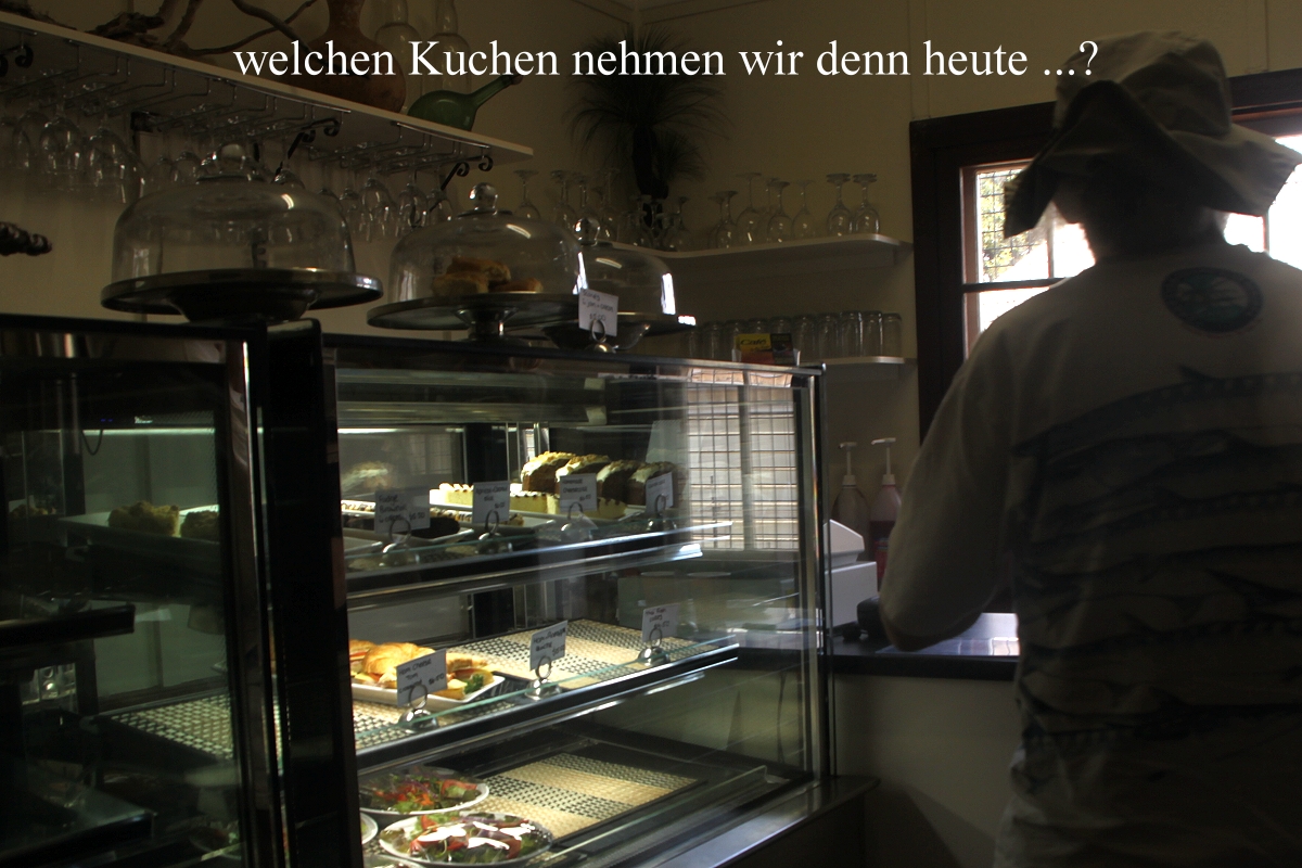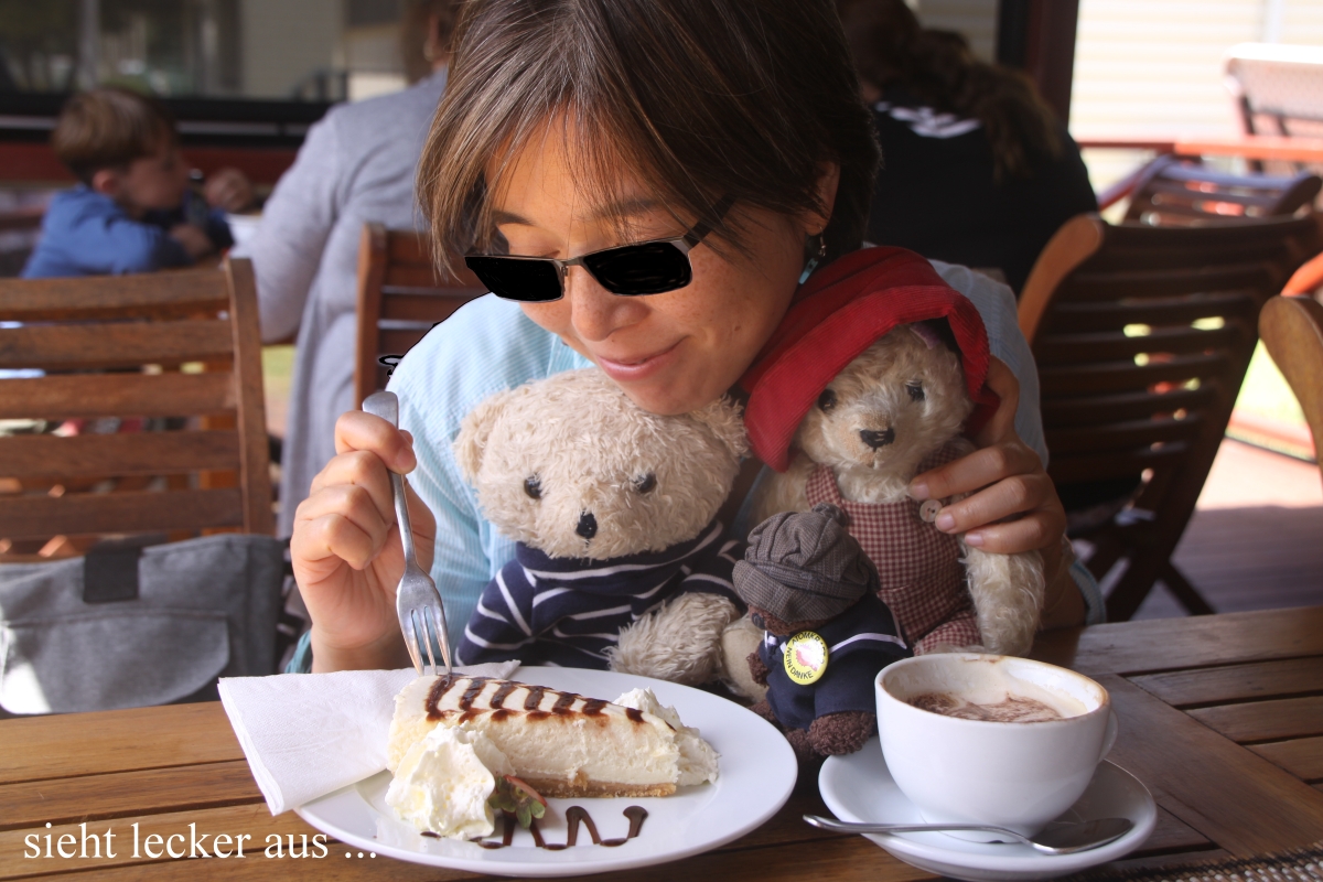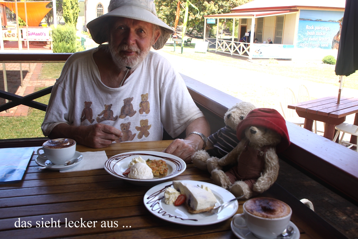 Die Gebäude, die hier um den grünen Rasen gruppiert waren, sind alte historische Gebäude, die jetzt modernen Zwecken dienen. Verschiedene Souvenir-Shops, Galerien, Museen und ein Café waren vorhanden. In das letztere gingen wir mit unseren Bären und verzehrten dort jeder einen mit Eis und Sahne verzierten Kuchen, wirklich außergewöhnlich lecker. Auch der obligatorische Cappuccino schmeckte toll. Der Preis war mit insgesamt 21,- $ für australische Verhältnisse akzeptabel. |